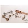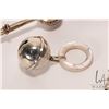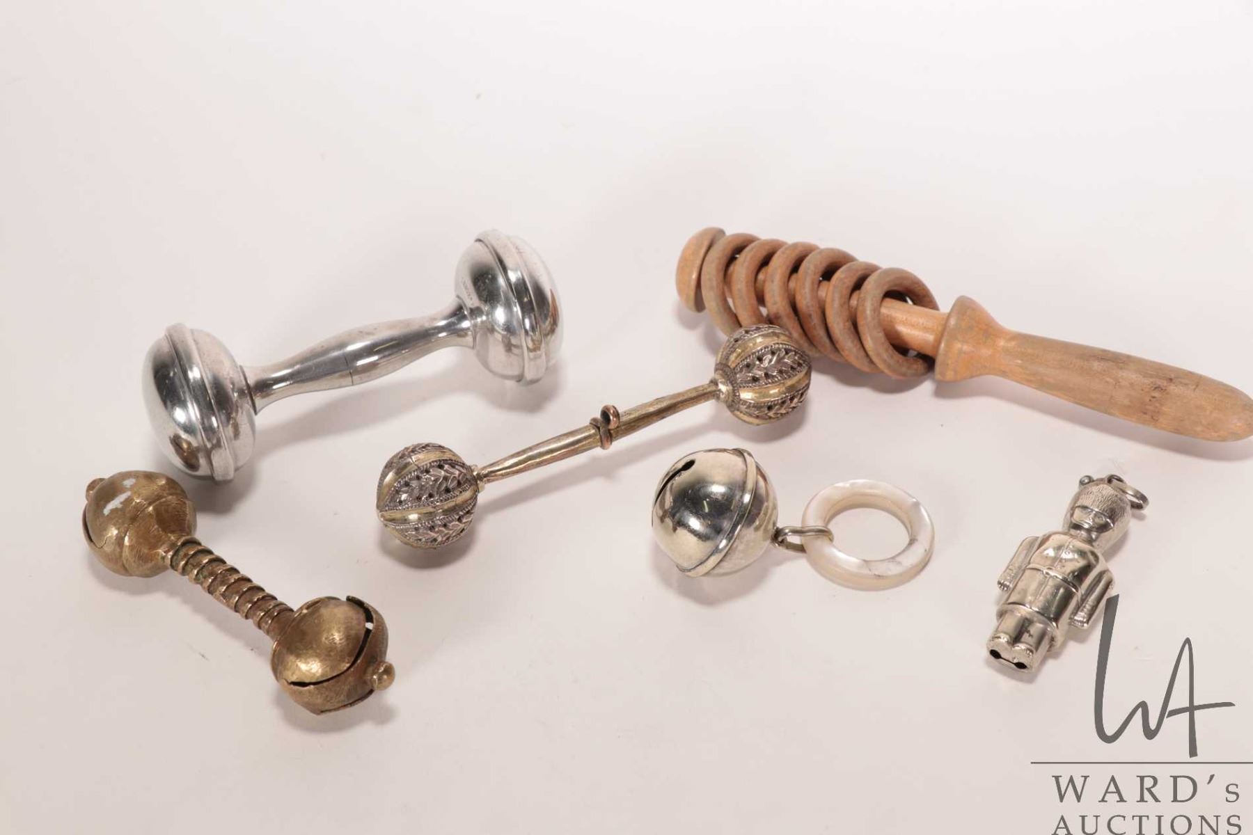 Selection of vintage and antique baby items including silver plate rattles, wooden rattle, and pierced metal barbells