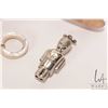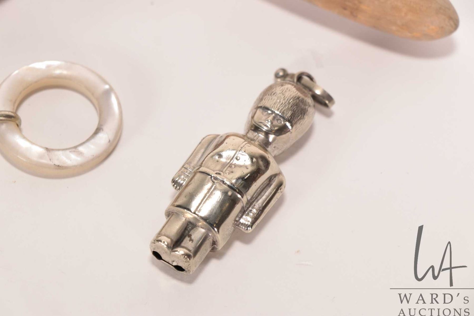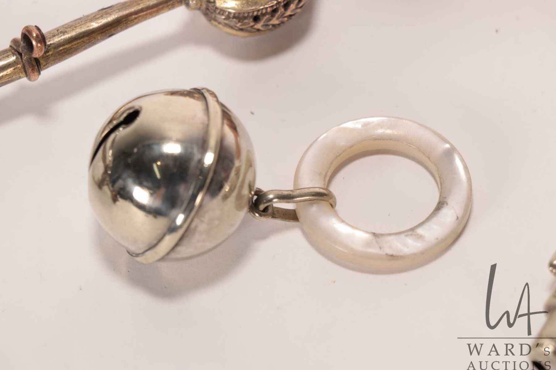 Selection of vintage and antique baby items including silver plate rattles, wooden rattle, and pierc