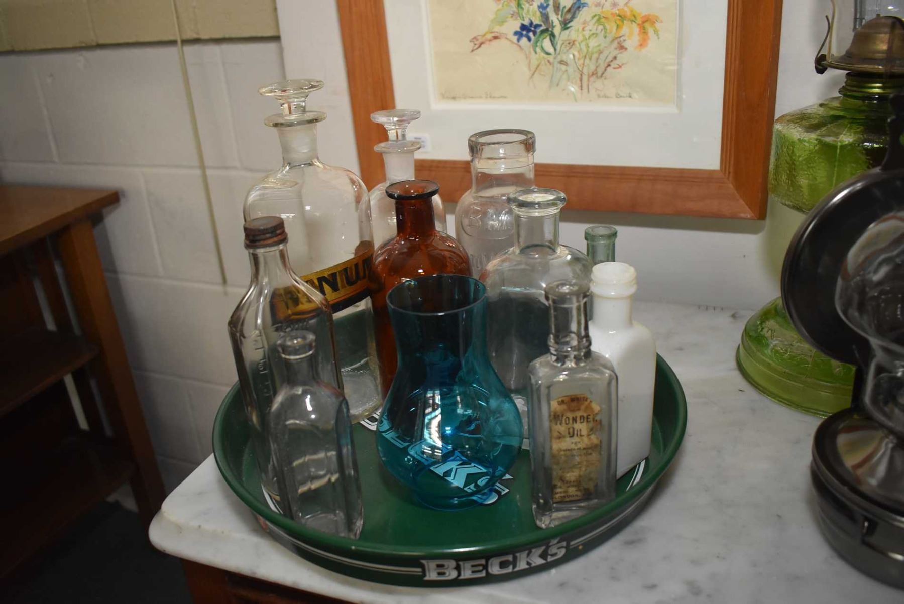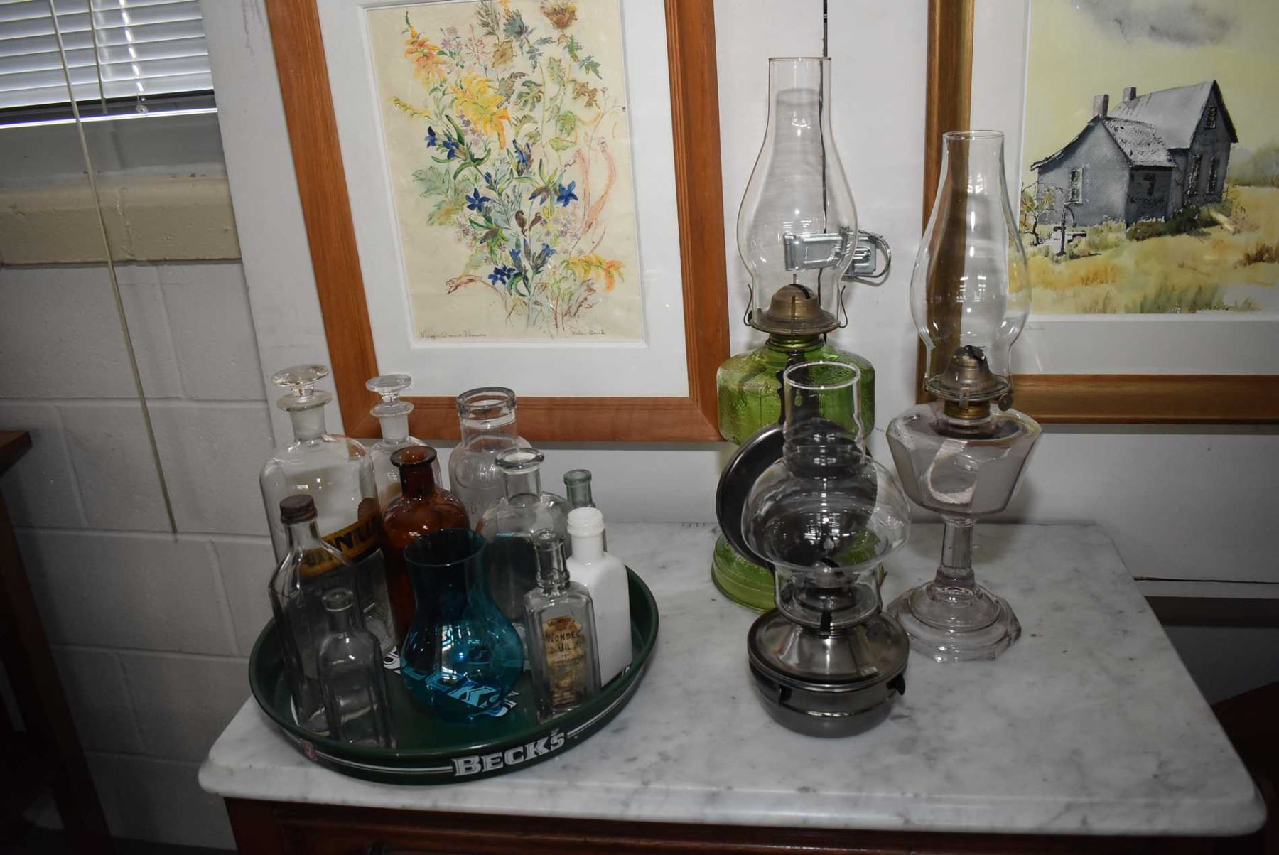 Selection of vintage and antique bottles including some with stopper and three oil lamps. Not available for shipping. Local pickup only