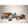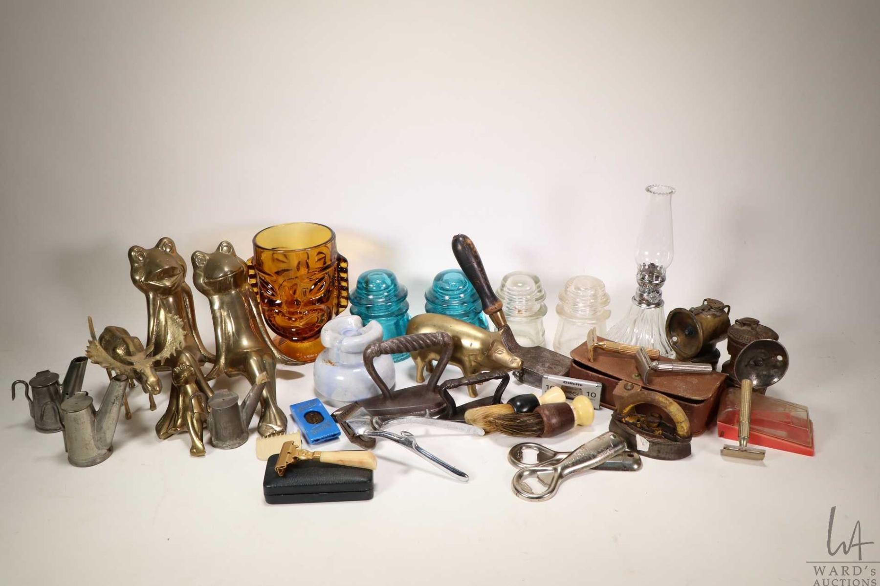 Selection of vintage and antique collectibles including miner's helmet lamp, coloured glass and ceramic insulators, shaving items, small sadirons, brass animal figures, colourless lamp etc.