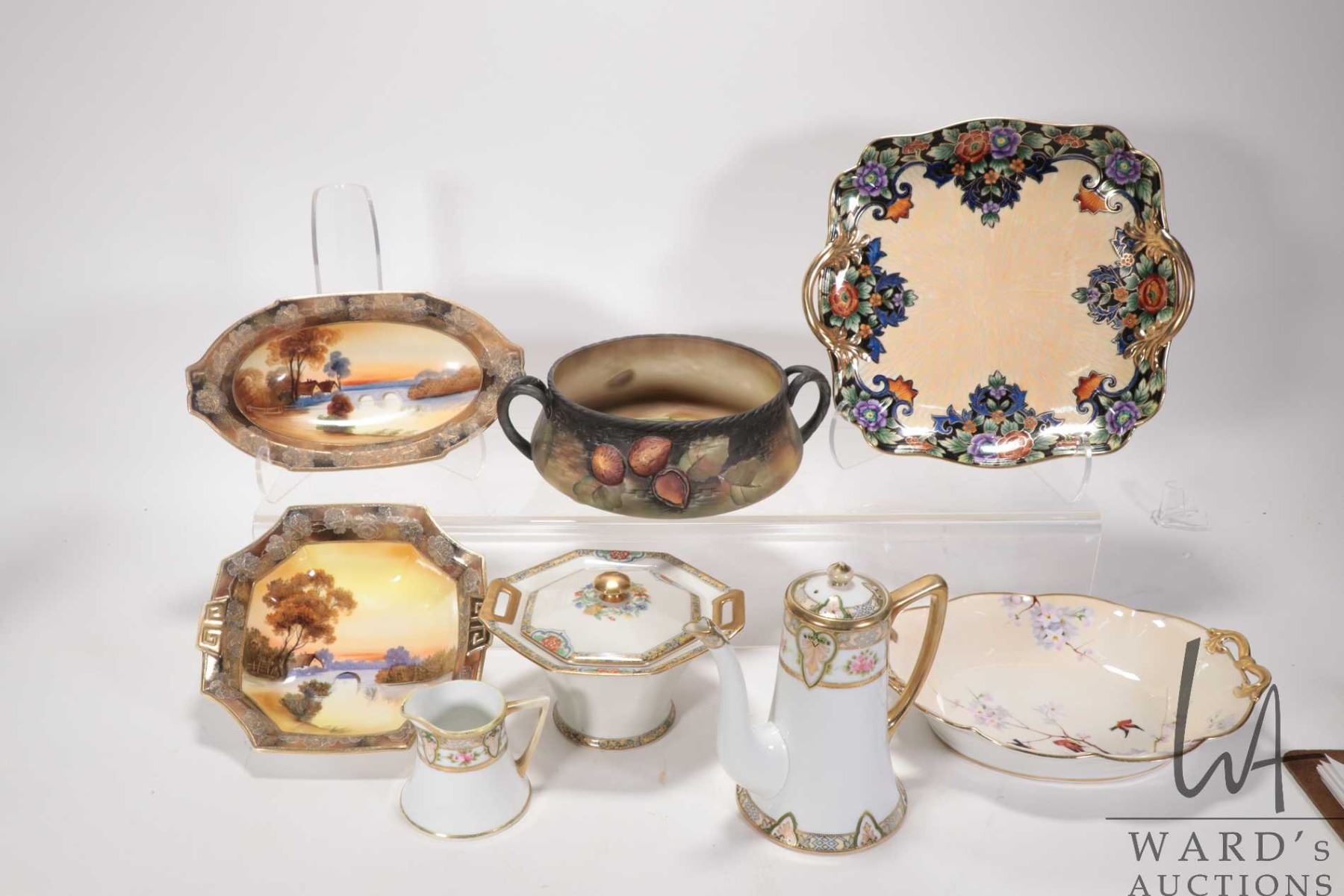 Selection of vintage and antique porcelain collectibles including 7" hand painted double handled Nippon bowl, Noritake including pictorial scenes and luster, small Nippon cocoa pot etc. NOTE: This Lot Is Not Available For Shipping. Local pickup only.