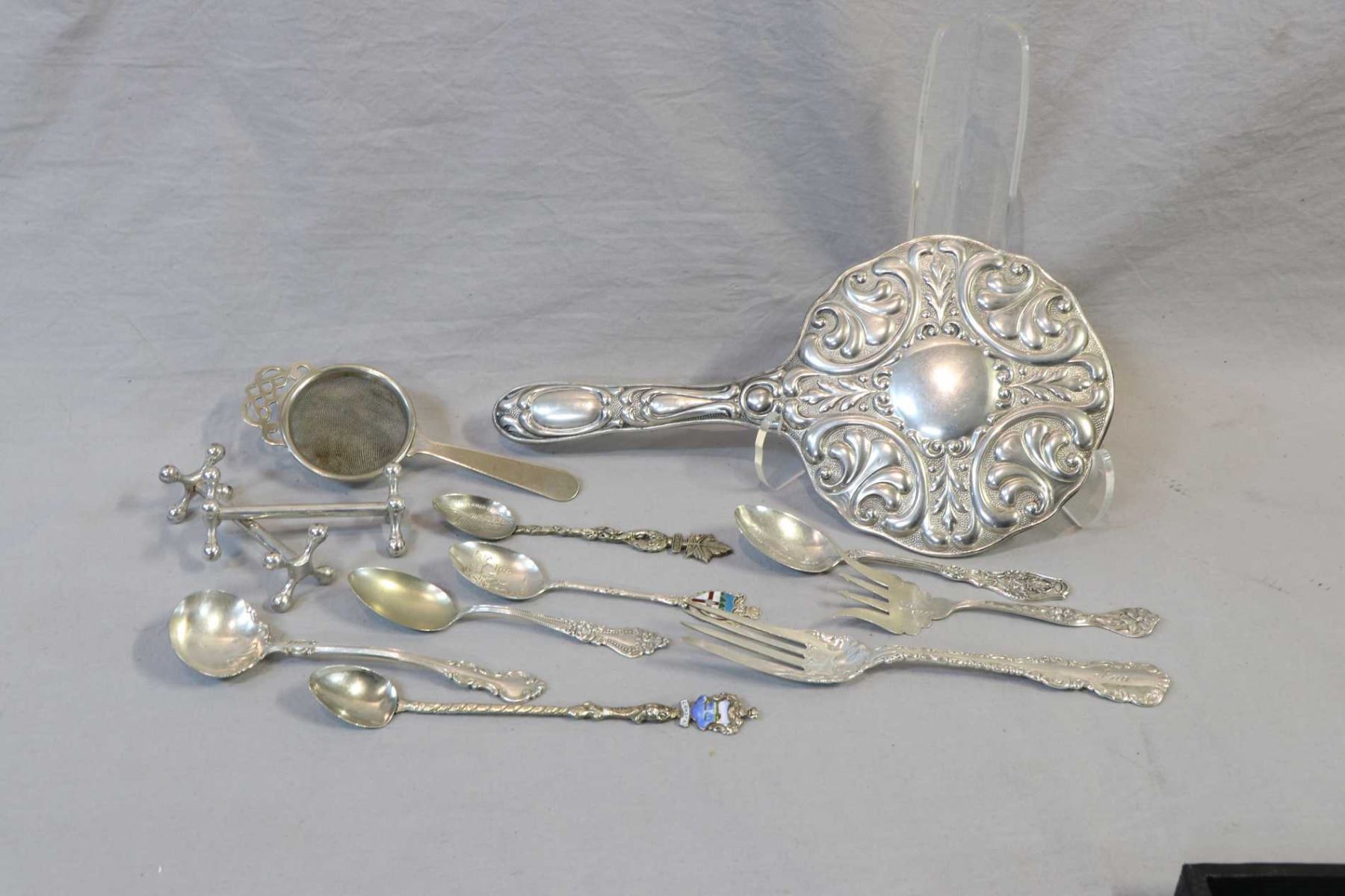 Selection of vintage and antique sterling and European silver including hand mirror marked 835, sterling serving pieces, spoons plus two silver-plate knife rests