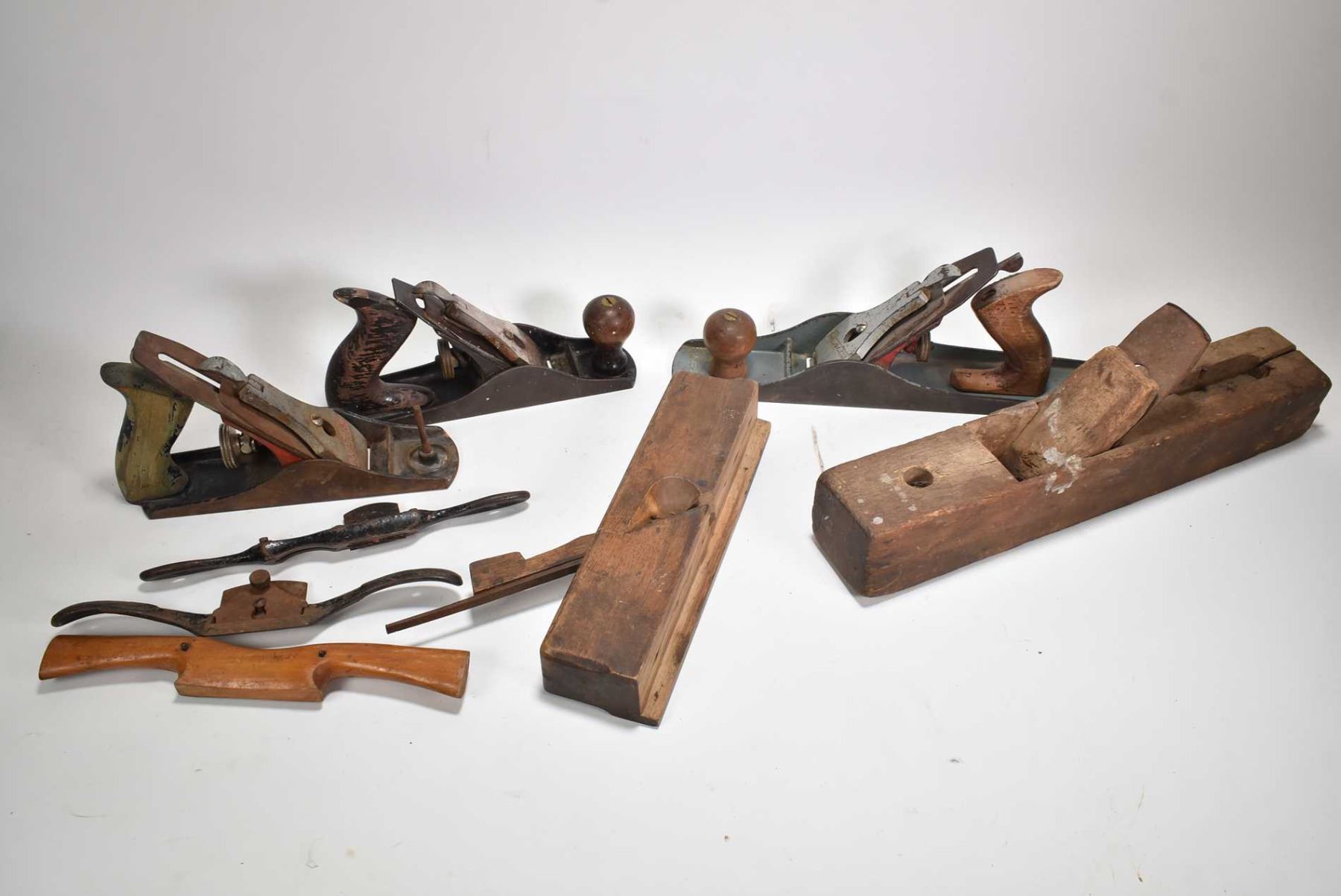 Selection of vintage and antique wood planes including Stanley no. 3, Canadian Handiman, two Stanley Handimans, antique wooden plane, edging wooden plane and three spoke shaves