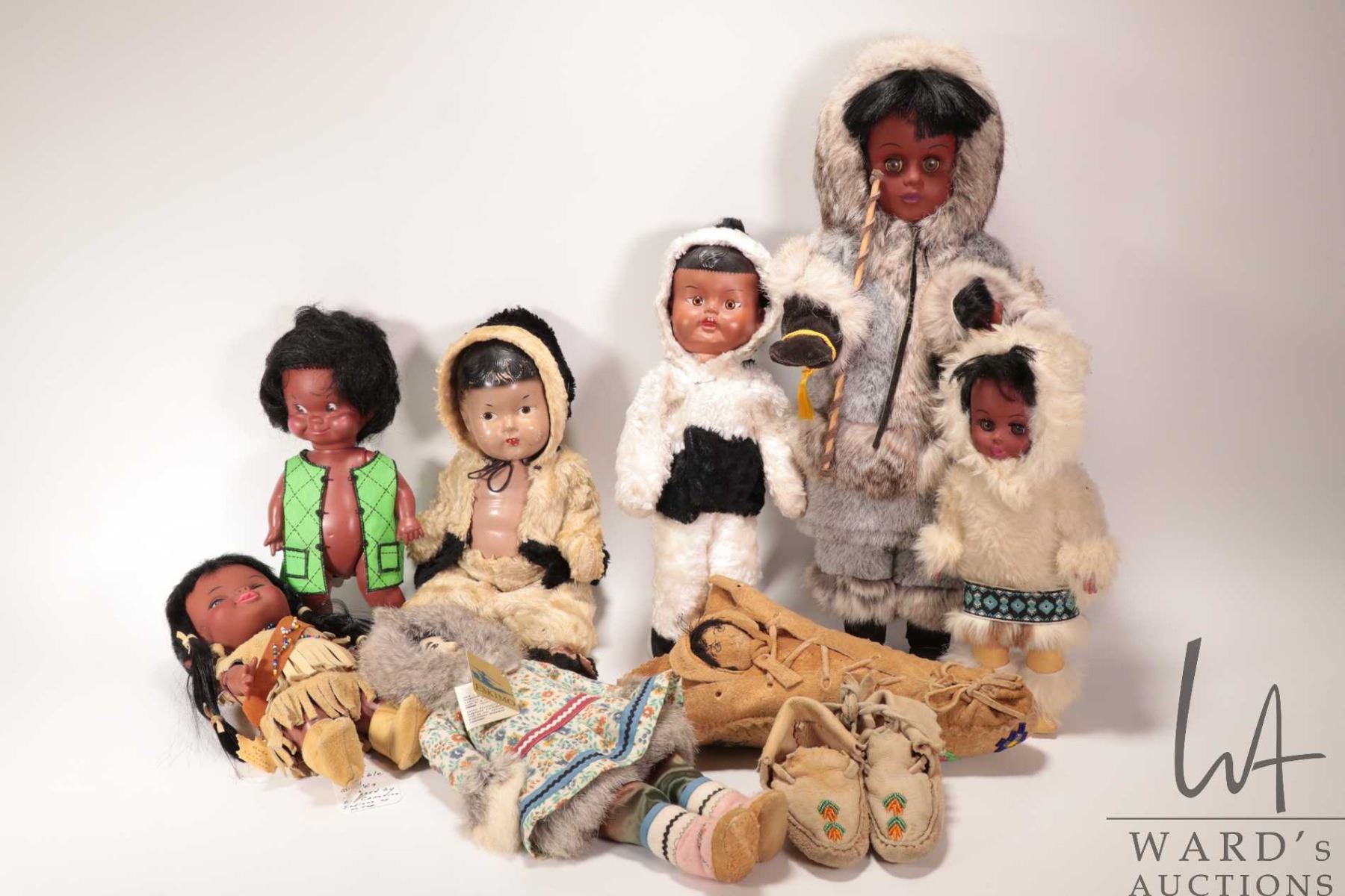 Selection of vintage and collectible Inuit dolls including Reliable Kimmie doll, Dee & Cee doll, Reliable composition doll, "Inuit Annie # 282" artist doll, made by artist June Klengenberg, Holman, handmade suede leather doll etc.
