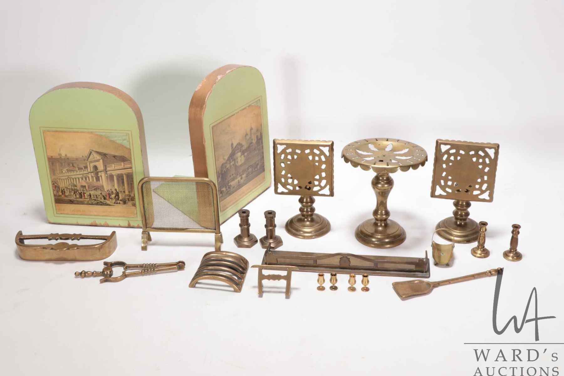 Selection of vintage and collectible brass dollhouse furniture including fire surrounds, tilt top tables etc. plus a pair of bookends