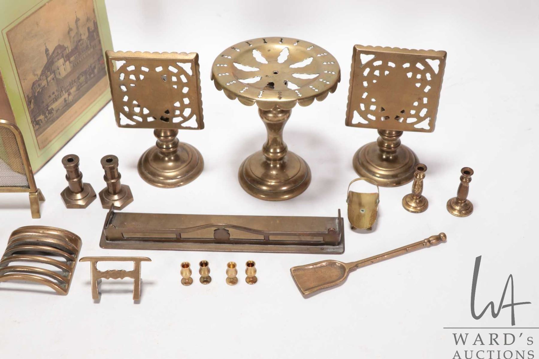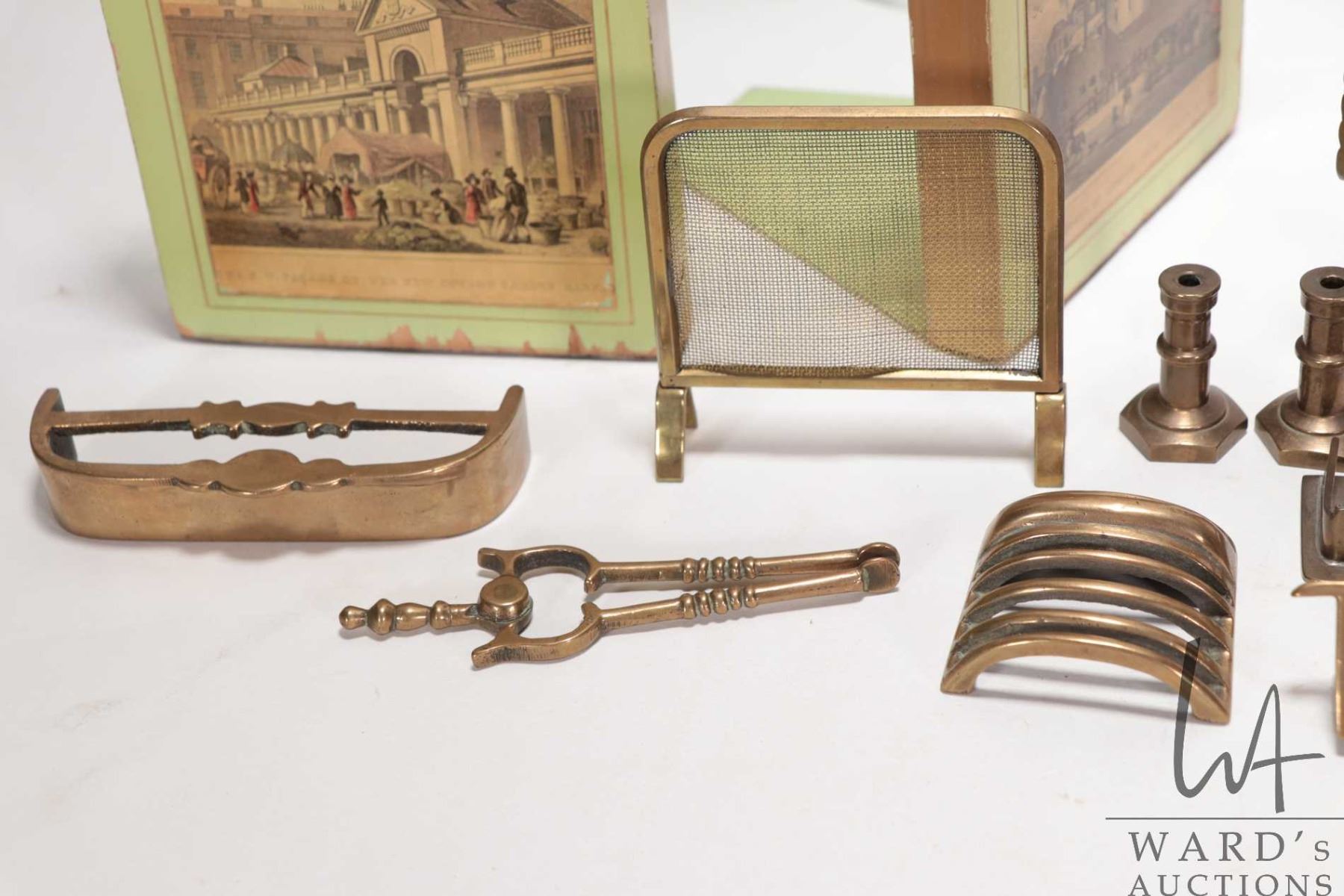 Selection of vintage and collectible brass dollhouse furniture including fire surrounds, tilt top ta
