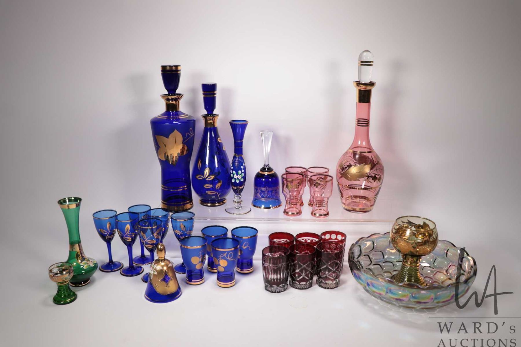 Selection of vintage and collectible glass including two gold overlay decanter and glass sets, Moser style glass, Klausen Roemer wine glasses etc. NOTE: This item is not available for shipping. Local pickup only