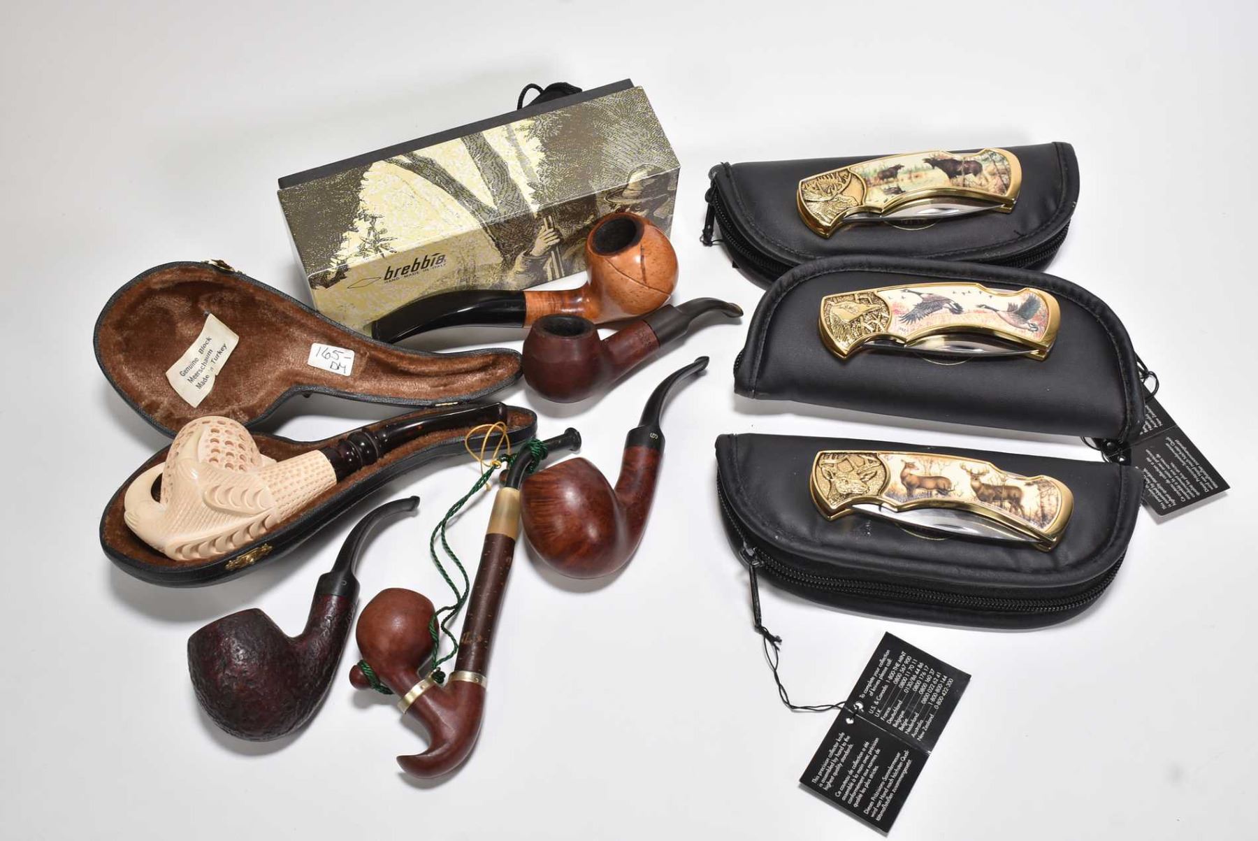 Selection of vintage and collectible pipes Turkish made Meerschaum pipe in fitted case, a boxed brebbia Italian made burl wood pipe, four additional wooden pipes and three Franklin Mint collectible pocket knives, each are 4" folding and come with zipper pouches
