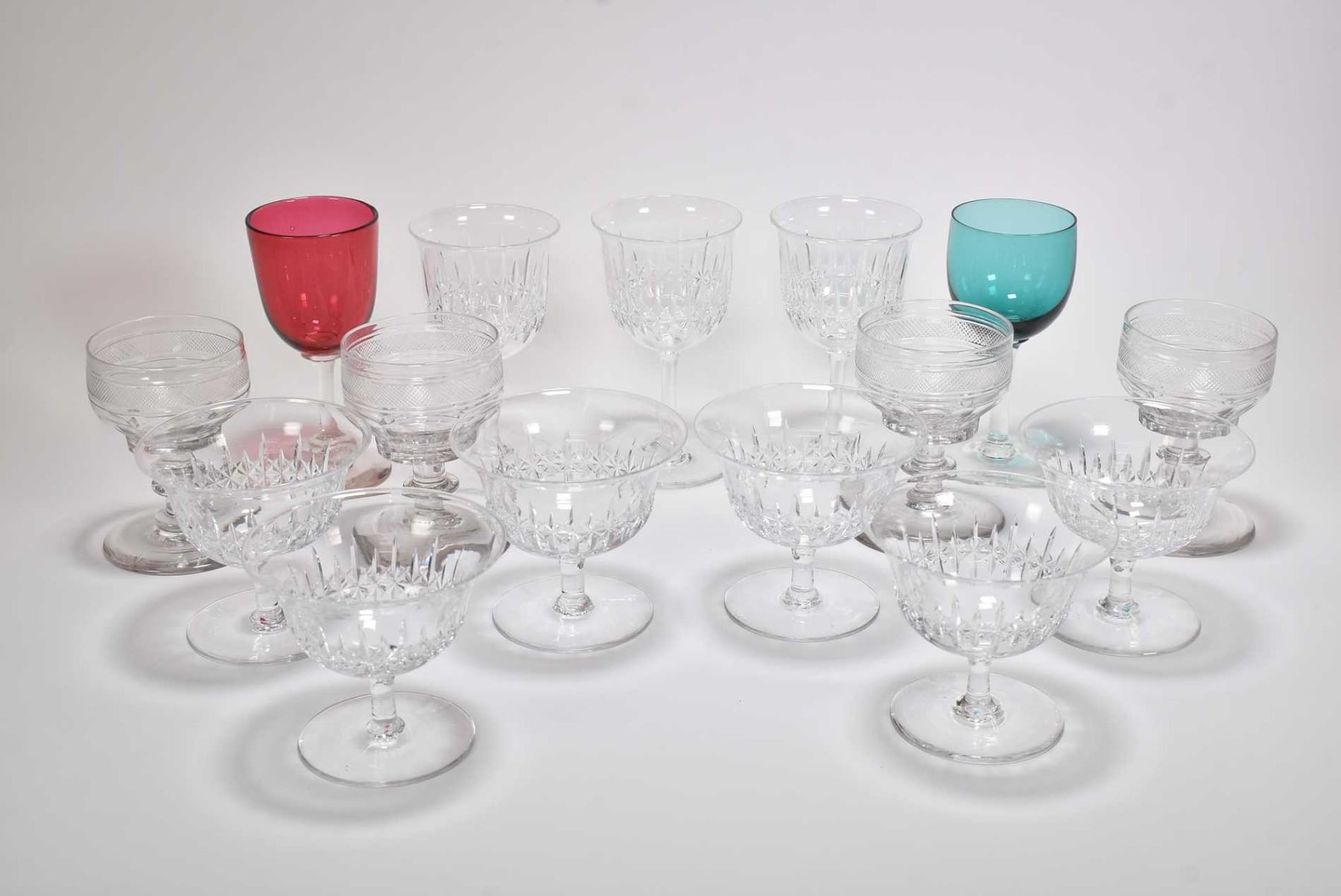 Selection of vintage and glass stemware including signed Webb & Corbet six sherbets and three matching sherry glasses, a ruby flash and a turquoise glasses plus four matching antique Georgian aperitifs