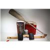 Selection of vintage and new camping items including a Howe Canoe carrying shoulder yoke, a new in box River Trail kerosene lantern, vintage gas can with built in spout, portable camps stove and a vintage oar