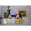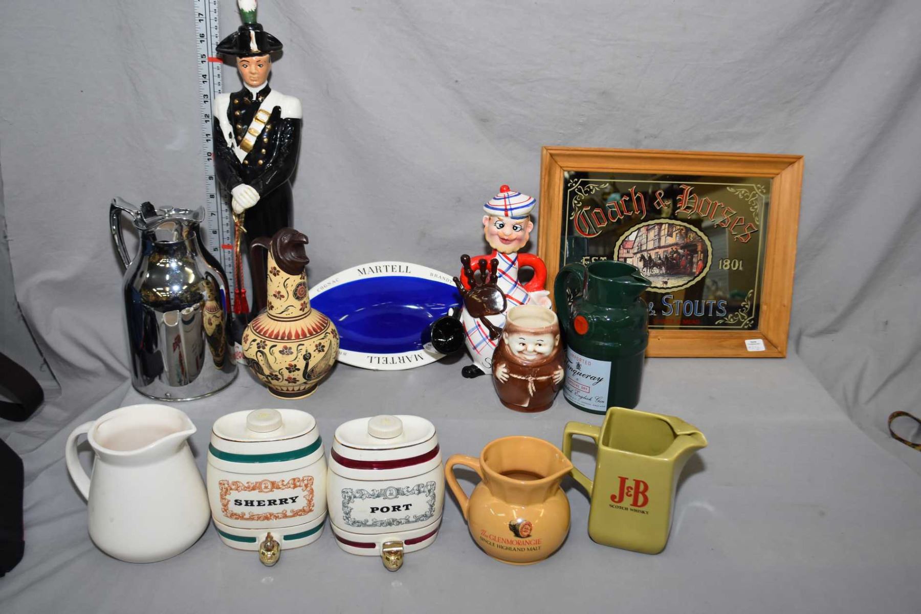 This item is not available for shipping. Local pickup only. Selection of vintage bar ware including ale jugs, Sherry and Port dispensers, figural liquor bottles, insulated carafe, Martell ashtray, and a Coach and Horses Ales and Stouts framed bar mirror etc.