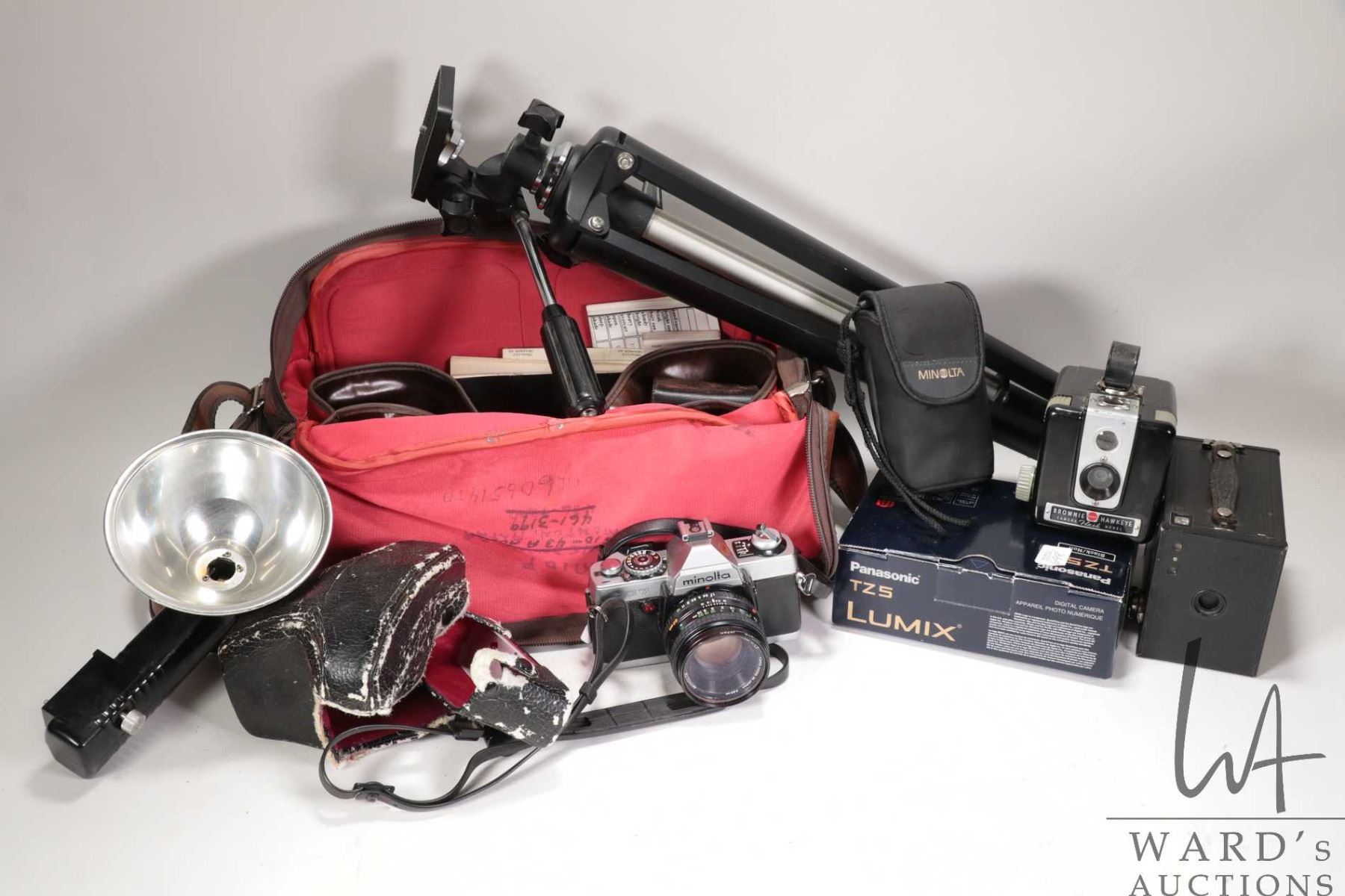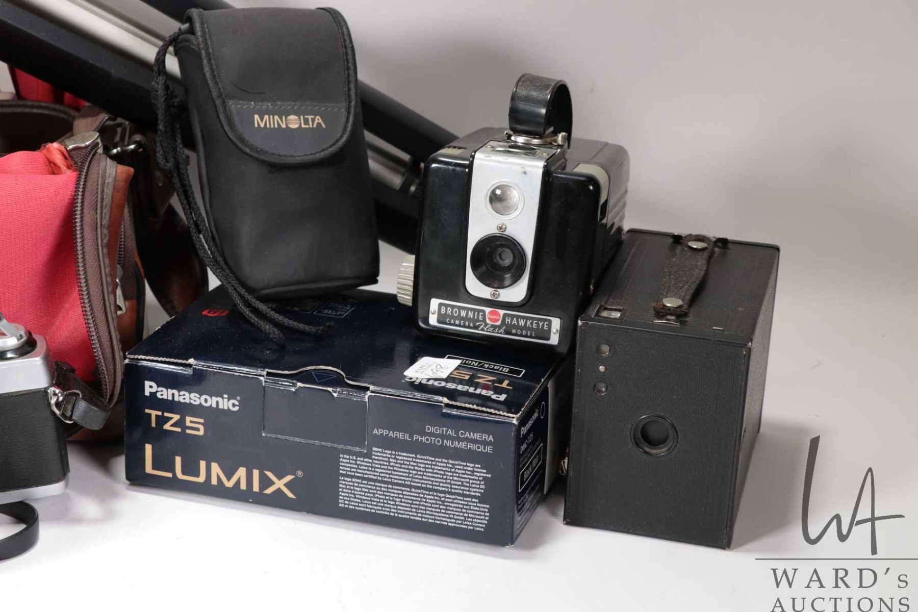 Selection of vintage camera equipment including Minolta Model XG7 camera with two lenses, flash etc. plus a Browning Hawkeye camera and a No. 2 Brownie camera, a Lumix Model TZ5 camera plus tri-pod etc.