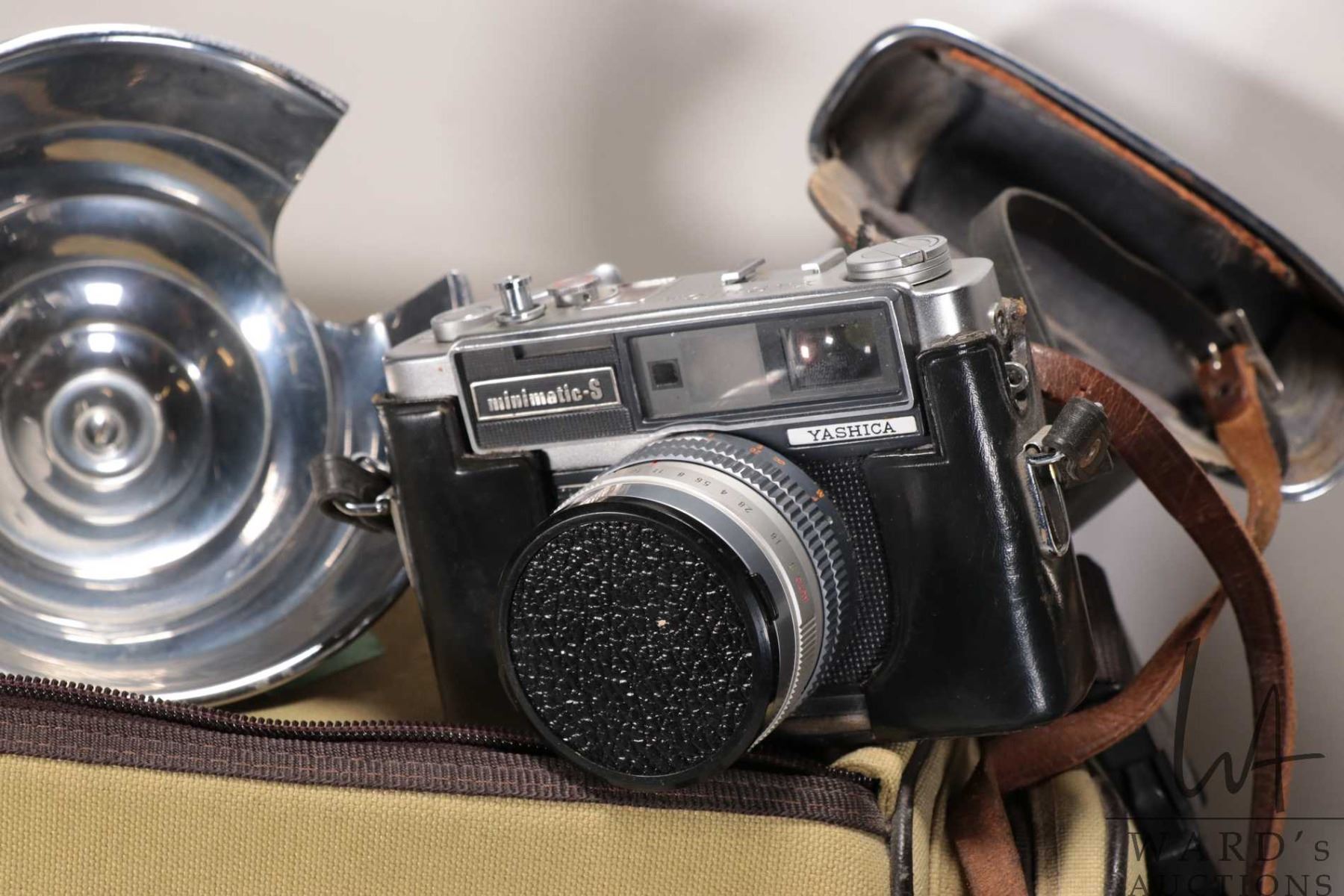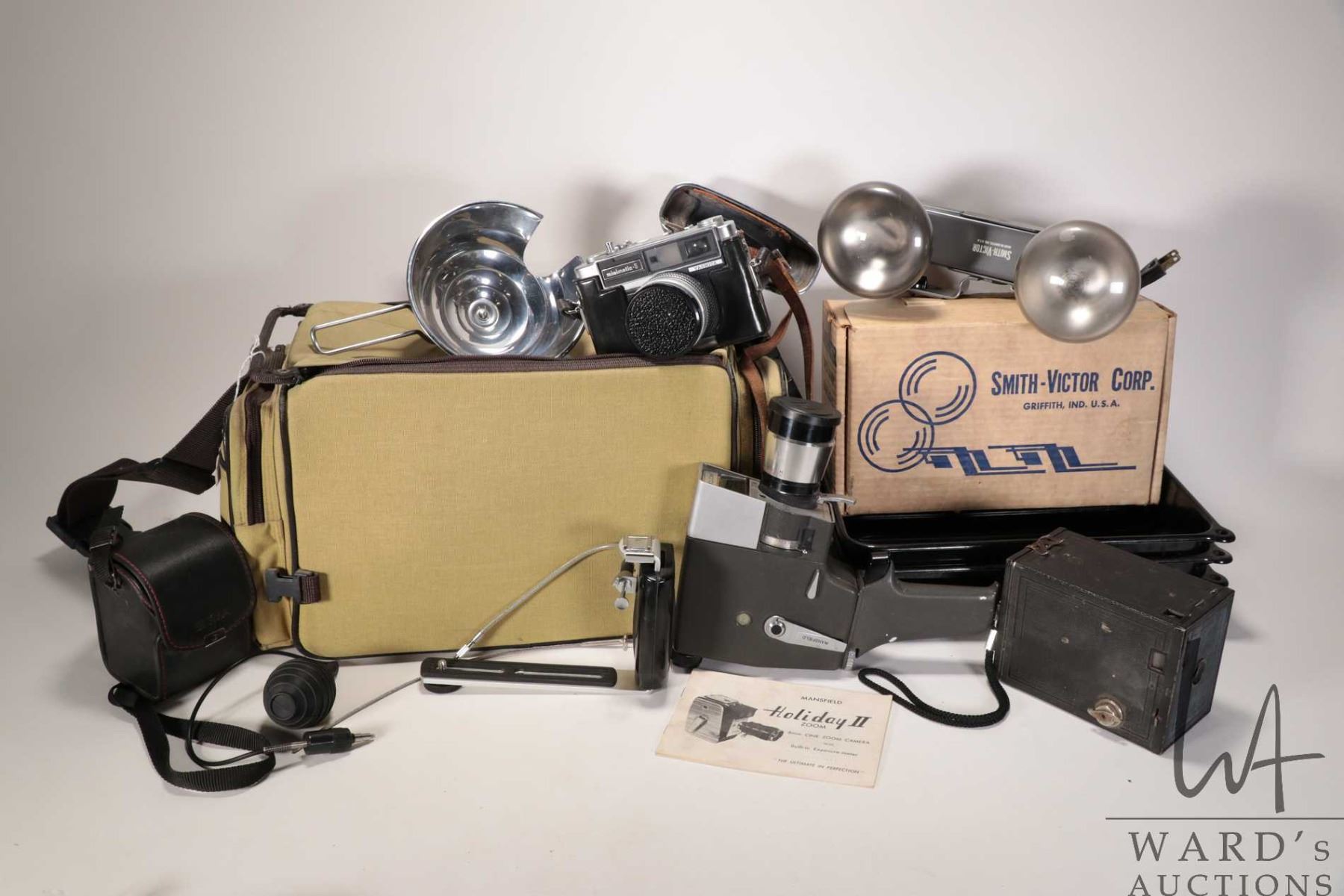 Selection of vintage cameras and accessories including Mansfield Holiday Japanese made ZE-II movie camera with reflex zoom, A Kodak No. 2 box camera, Yashica Minimatic S camera with lens, leather case and a multitude of accessories including flash cable activator, camera mount, assorted lenses, three developing trays, Smith Victor flash etc.