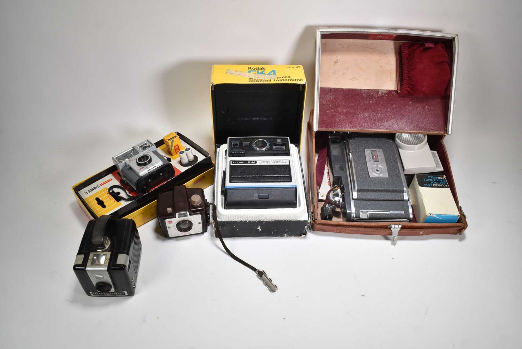 Selection of vintage cameras including Polaroid 900 Electric Eye land camera with accessories and case, Starmite II Brownie camera in original box, Kodak EK 4 Instant camera in box, Browning Hawkeye and a Browning Holiday