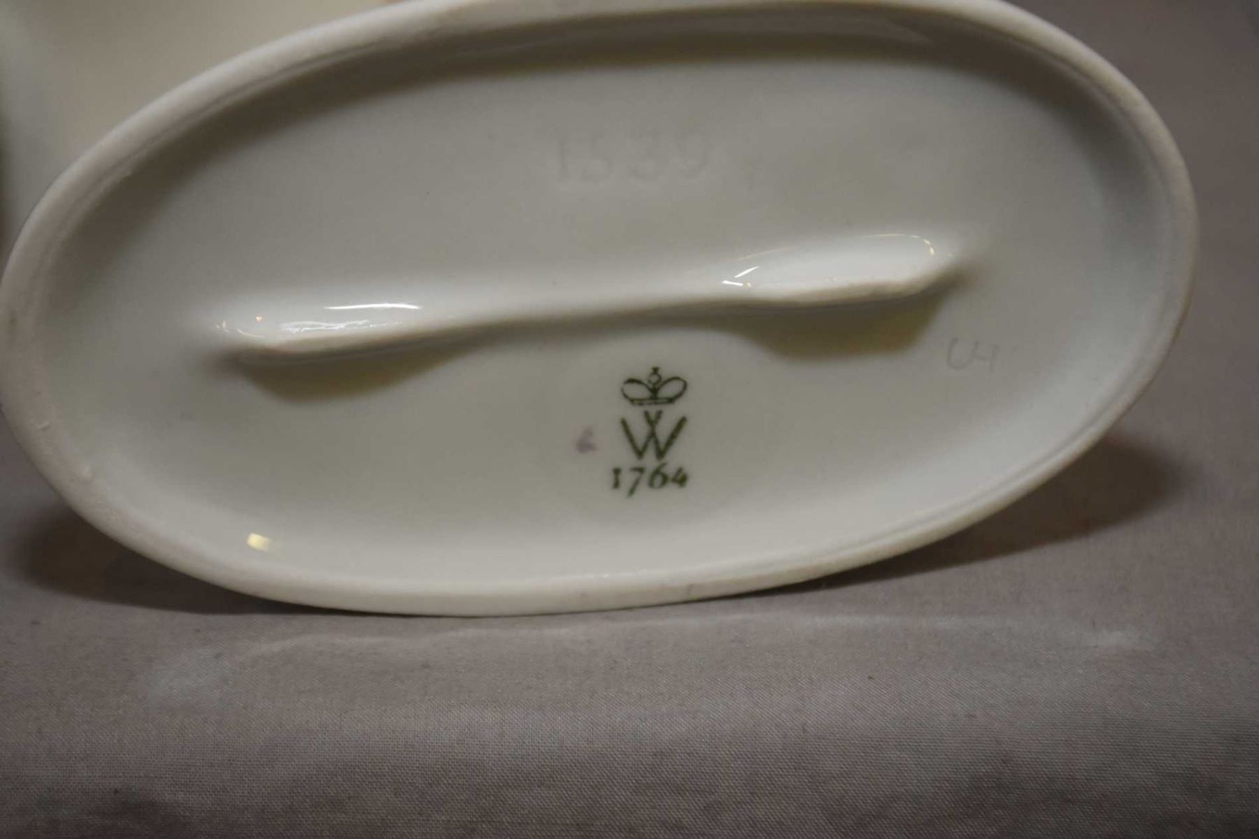 Selection of vintage china collectibles including three German porcelain figurines and a 10 1/2" girandole with hand enamelling and crystal lustres