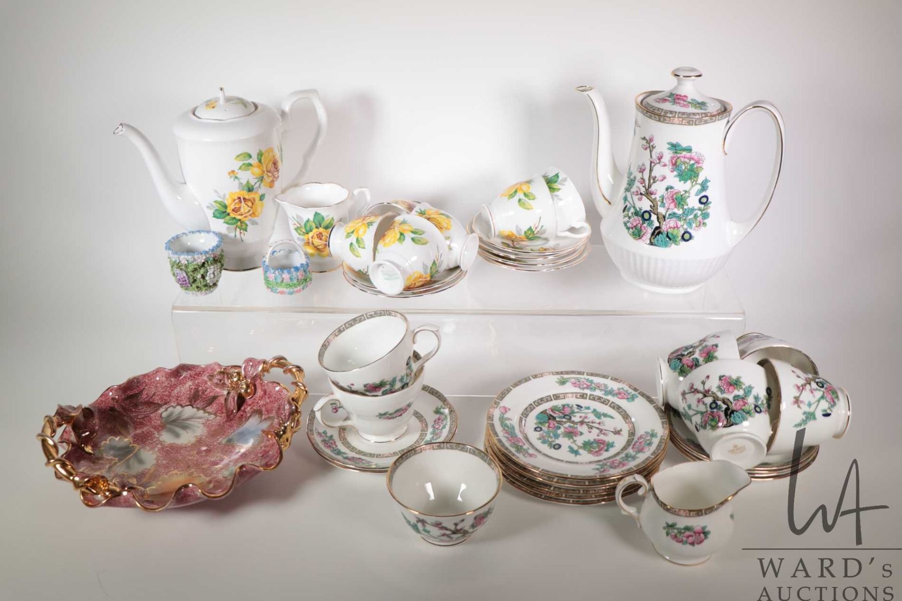 Selection of vintage china including Duchess India Tree teapot, cream and sugar plus six teacups and saucers and six side plate, plus Royal Stafford yellow rose teapot, six demis and saucers plus a cream jug, two small Moriage china cabinet pieces and an Italian made lustreware dish. Note: Not available for shipping. Local pickup only