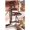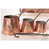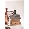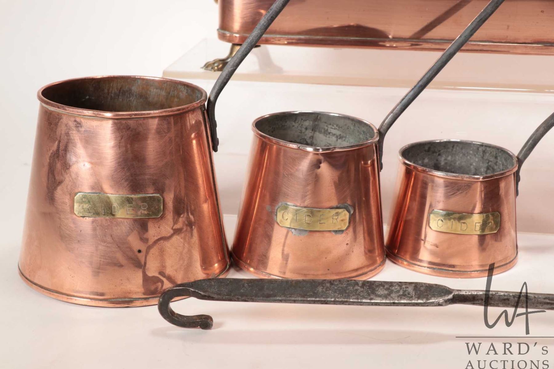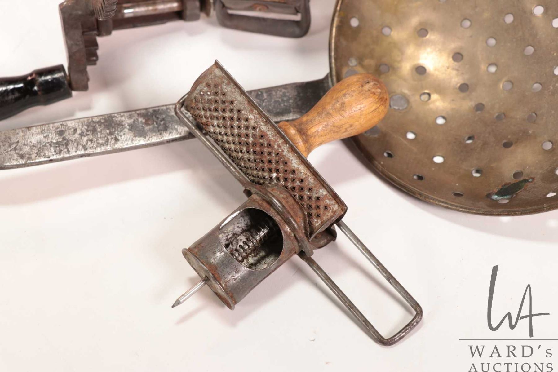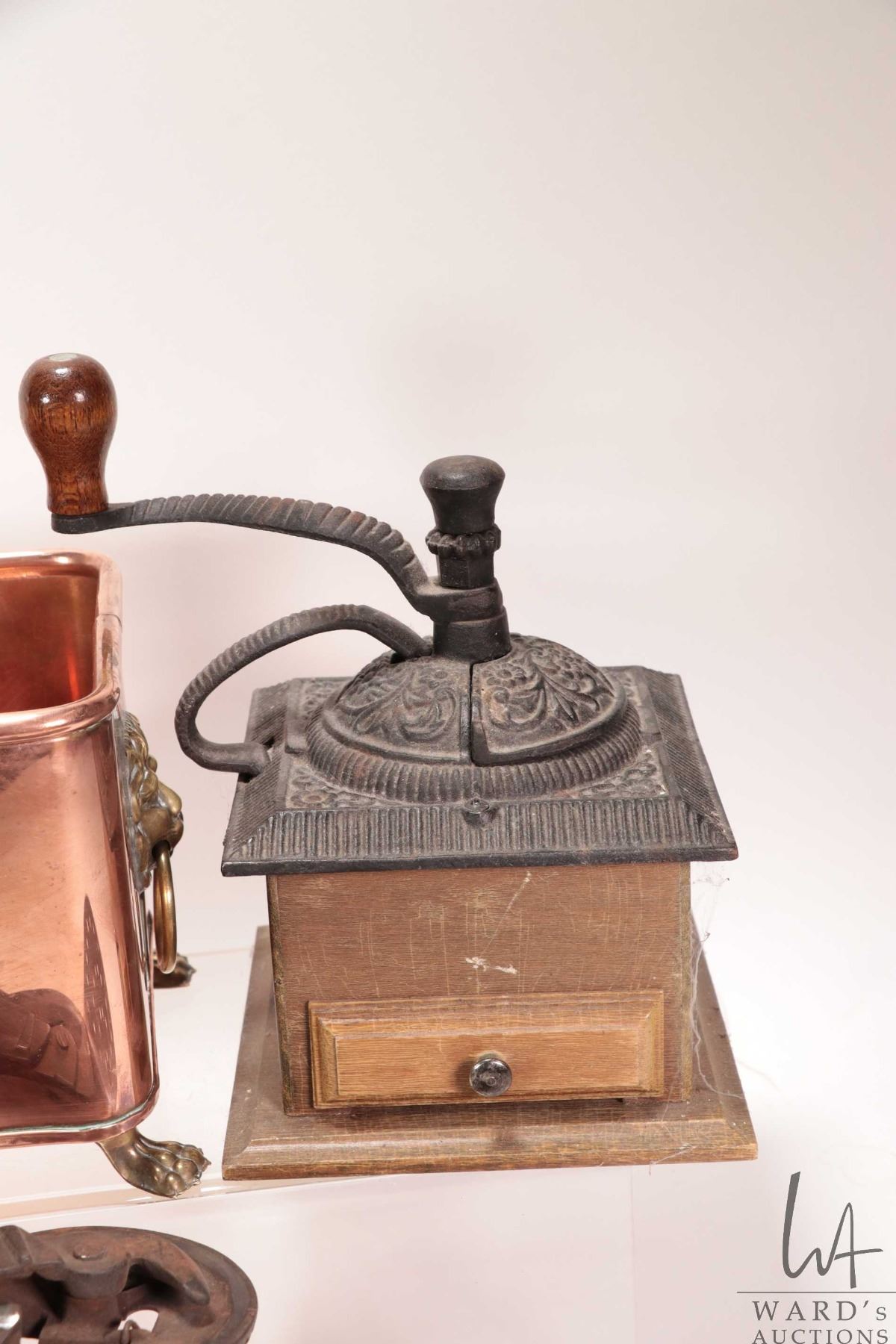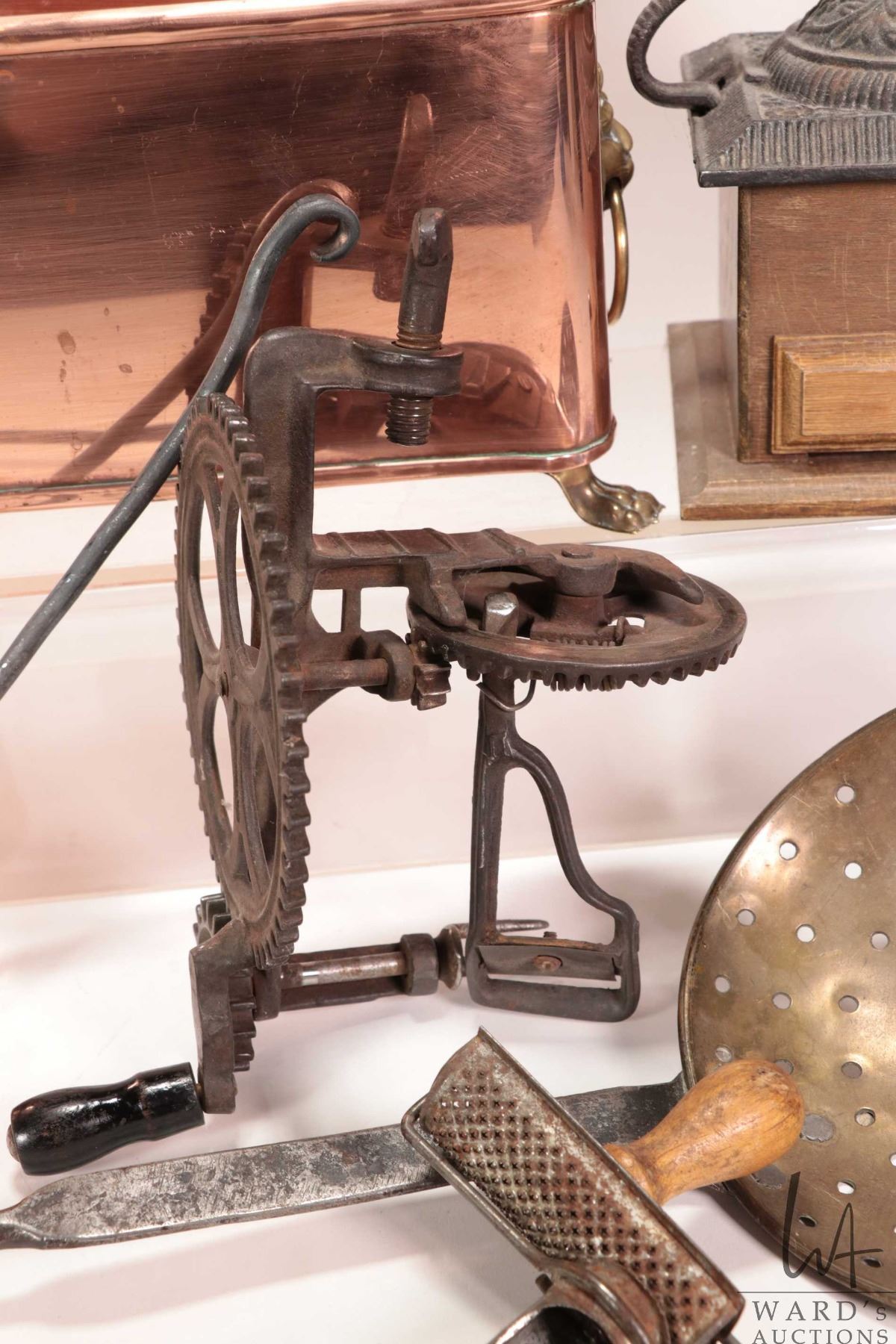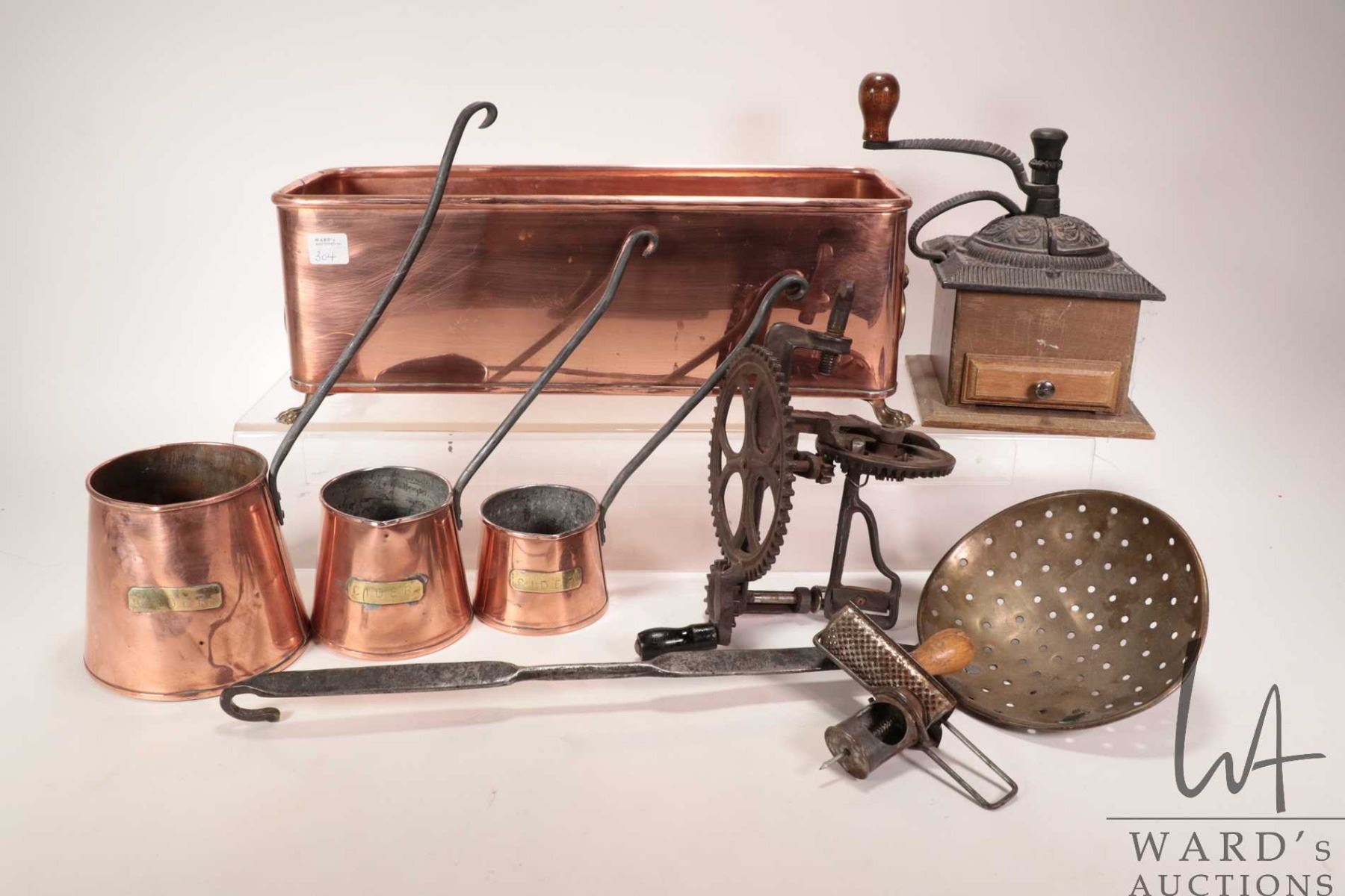 Selection of vintage collectible including brass and copper lion motif jardiniere, three graduated copper cider ladles, pierced strainer, apple peeler, nutmeg grinder and a coffee grinder