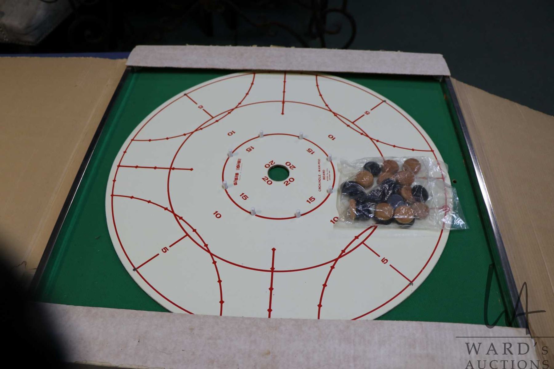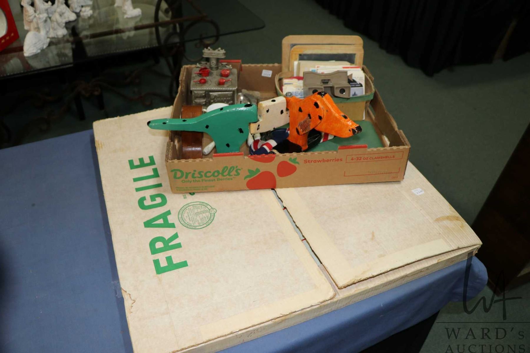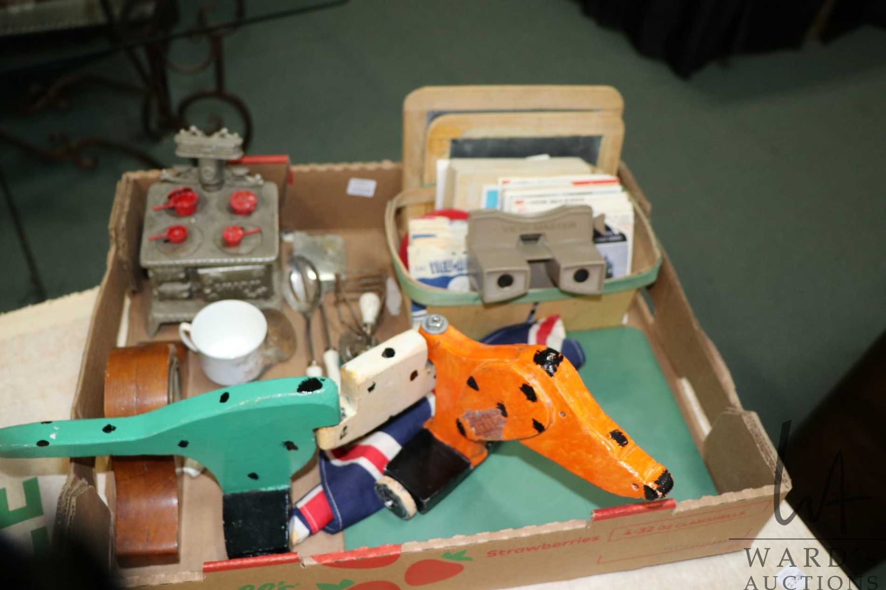 Selection of vintage collectible toys including cast "Charm" stove with pans, small top hat mantle clock, pull toy, View Master with slide, child sized kitchen utensils, two small chalk boards and a boxed and a Crokinole-Wam-Poo game board by Munro Games