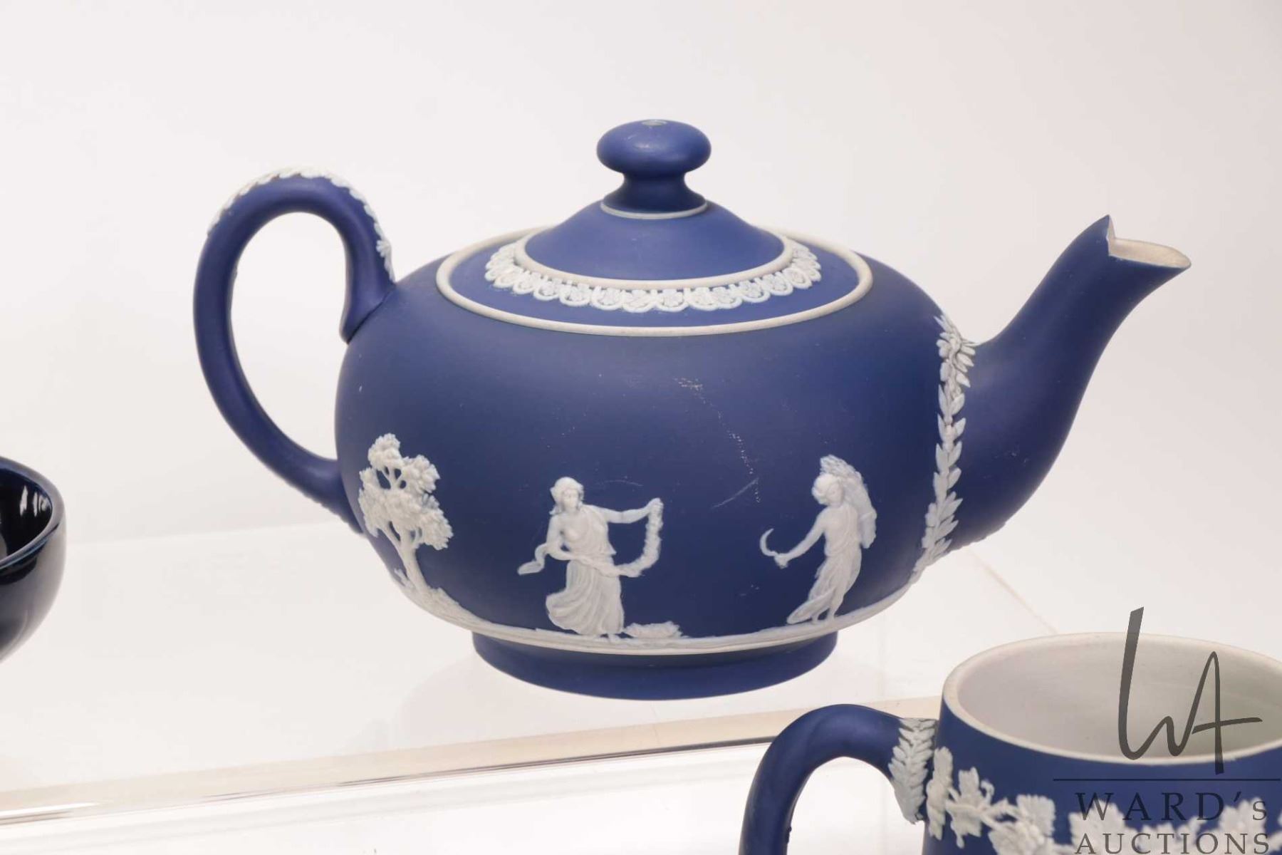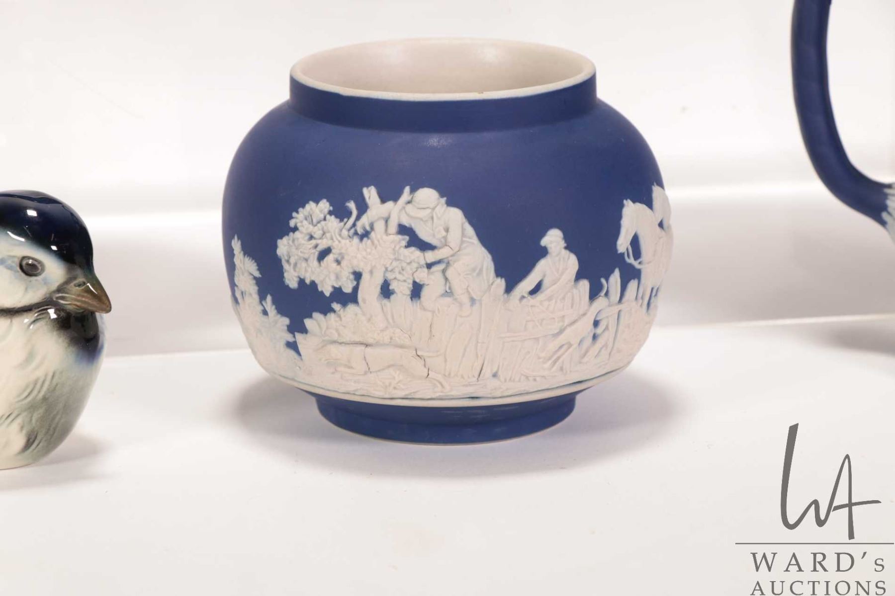 Selection of vintage collectibles including Adams jasperware teapot, pitcher and rose bowl, terracot