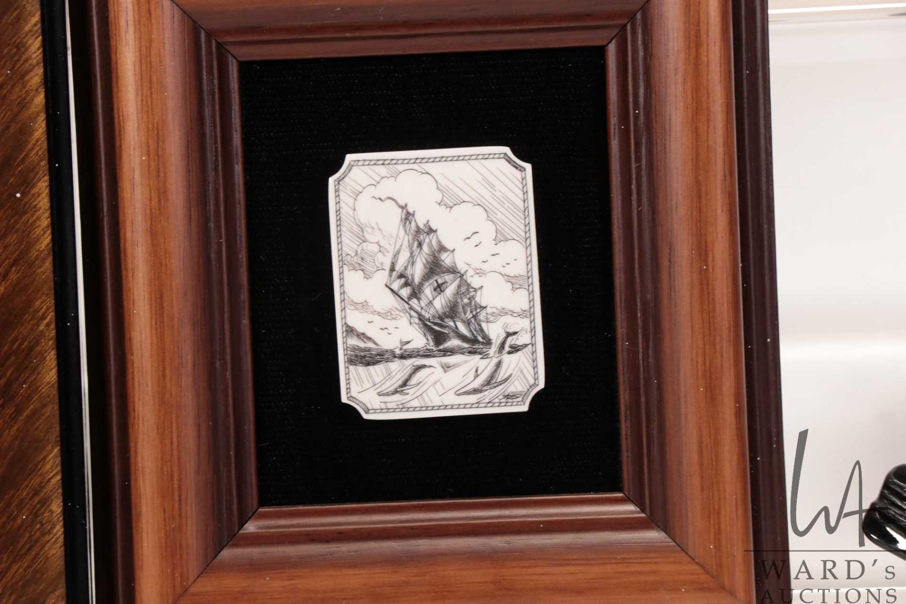 Selection of vintage collectibles including Adams jasperware teapot, pitcher and rose bowl, terracotta teapot, 4 1/2" diameter Moorcroft bowl and two frames scrimshaw miniature plaques plus a Goebel bird