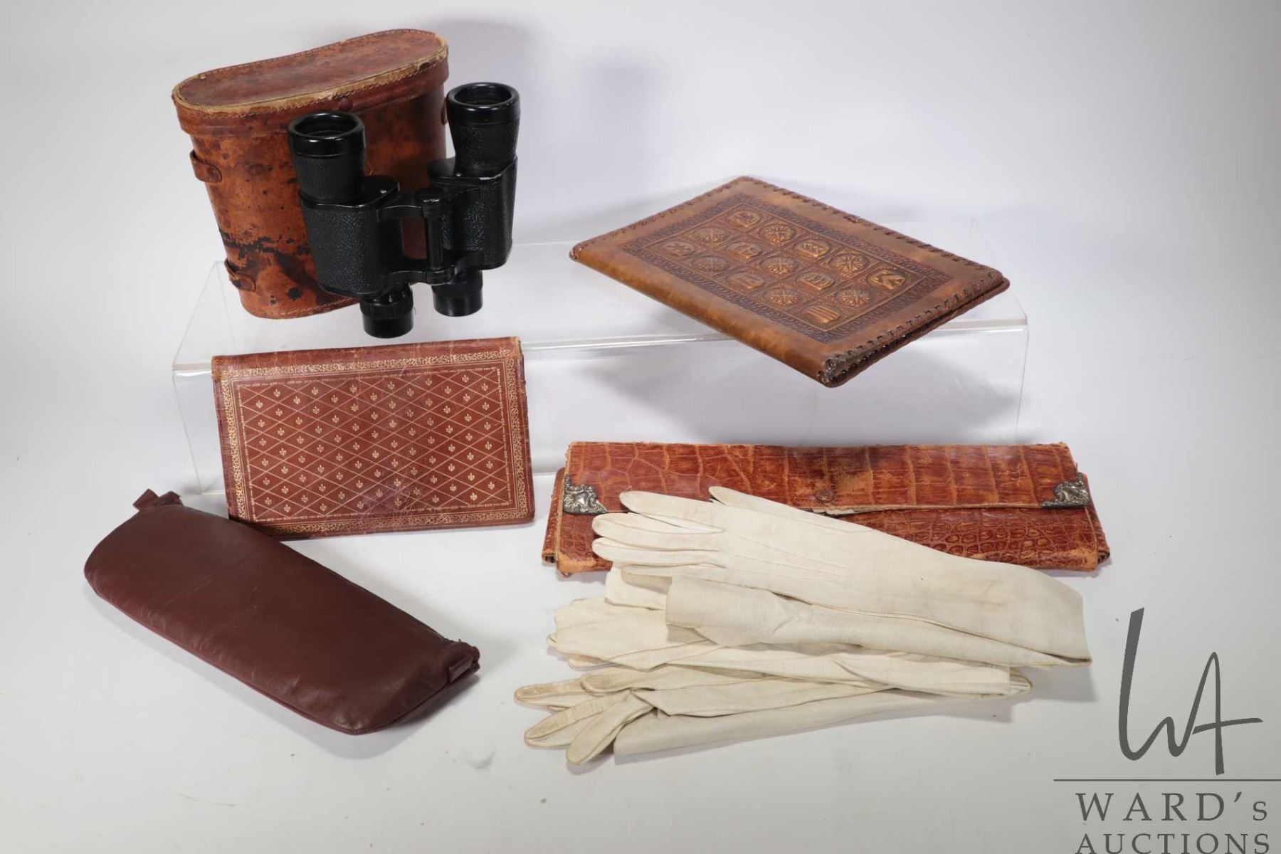 Selection of vintage collectibles including Fleur-de-lis pocket book, alligator hide glove box with two sets of ladies kid leather gloves, zippered travel case with pair of brown kid leather slippers, embossed leather book cover and a vintage pair of Kurt Deutz binoculars with case.