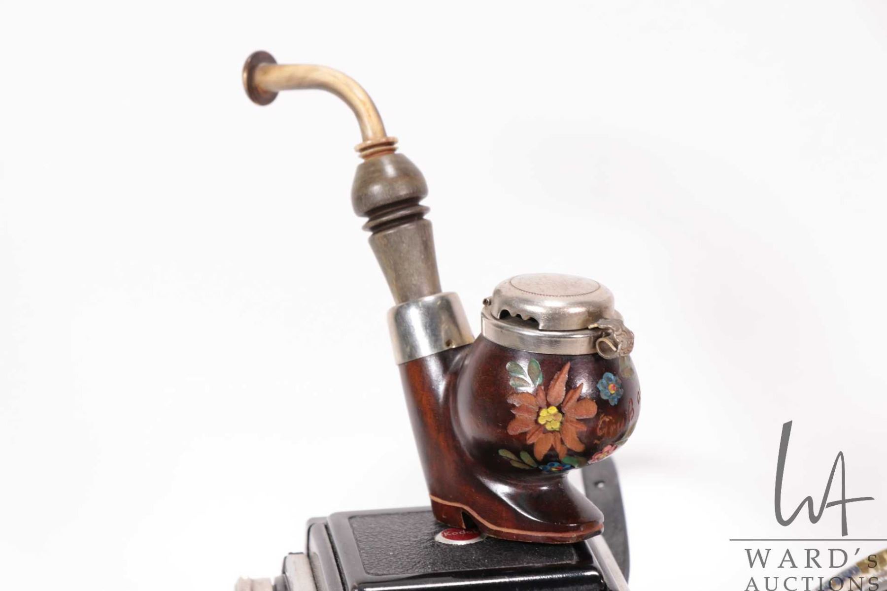 Selection of vintage collectibles including Kodak Duaflex II camera with attached flash, Arcadia Commander Self-illuminating viewer in box, T.G.K Star Harmonica, brass weather gauge, hand enameled and artist signed metal dish, small wooden stein, cigar cutter, pipe etc.