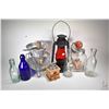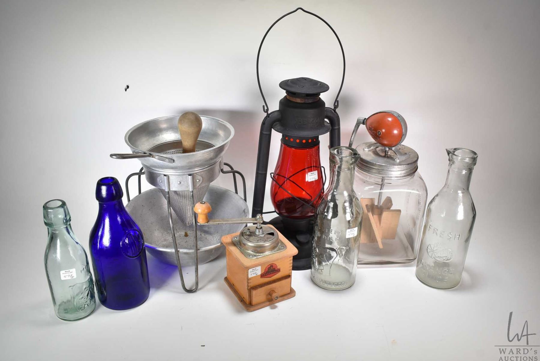 Selection of vintage collectibles including a Blow glass butter churn, a Zassenhaus grinder, an aluminium vegetable ricer with bowl plus a Beacon red lens barn lantern and cobalt glass milk bottle and three vintage juice and milk bottles