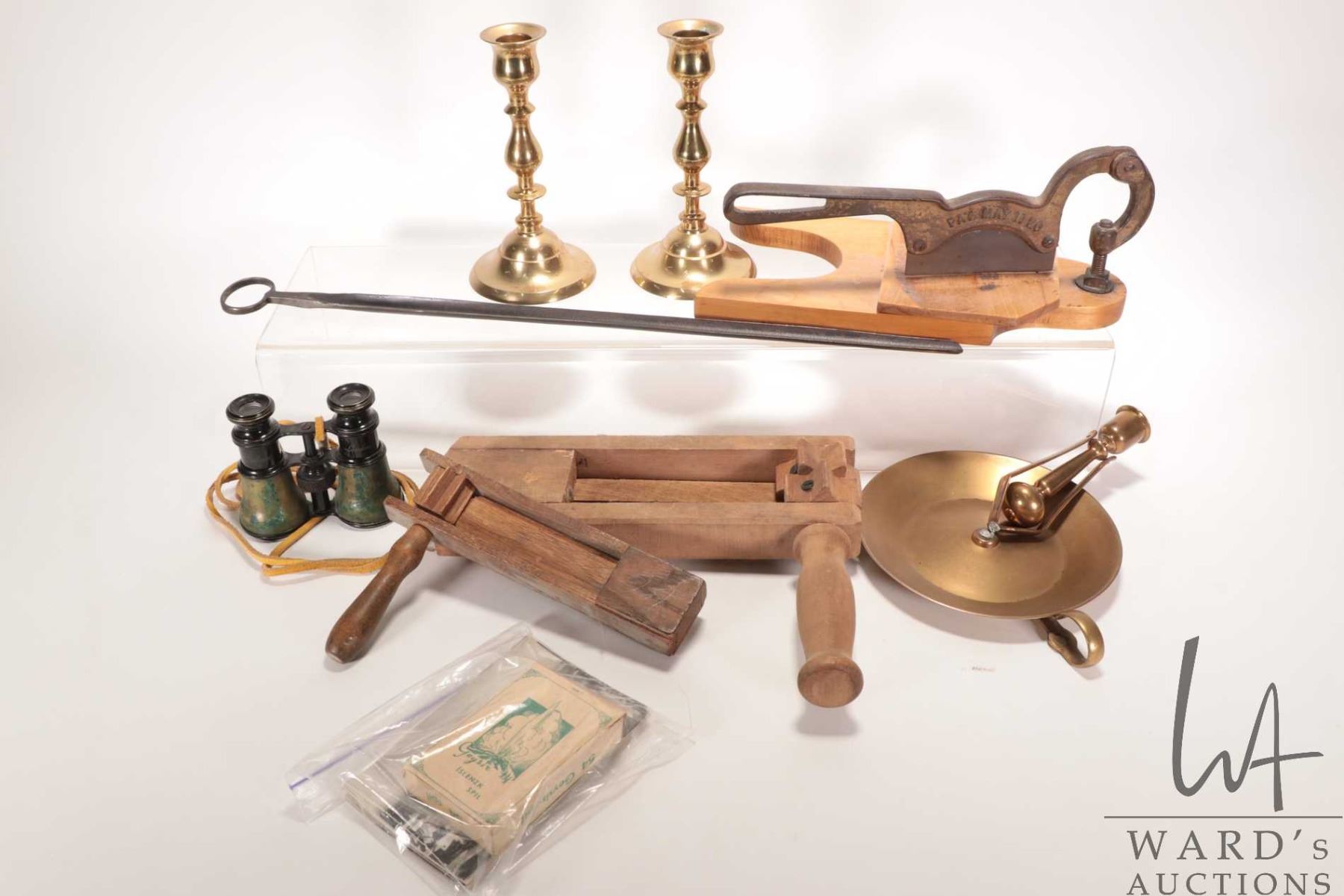Selection of vintage collectibles including antique Boker steel cheese thief, tobacco cutter, brass ship's candlestick, vintage wooden noise makers, set of Dollond London Opera glasses, set of Iceland Geysir playing cards and a selection of Iceland postcards