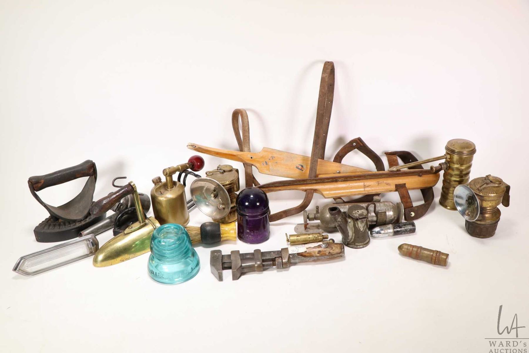 Selection of vintage collectibles including mini torch, miner's head lamps, glass insulators, skates, sadirons, tools, oiler etc.