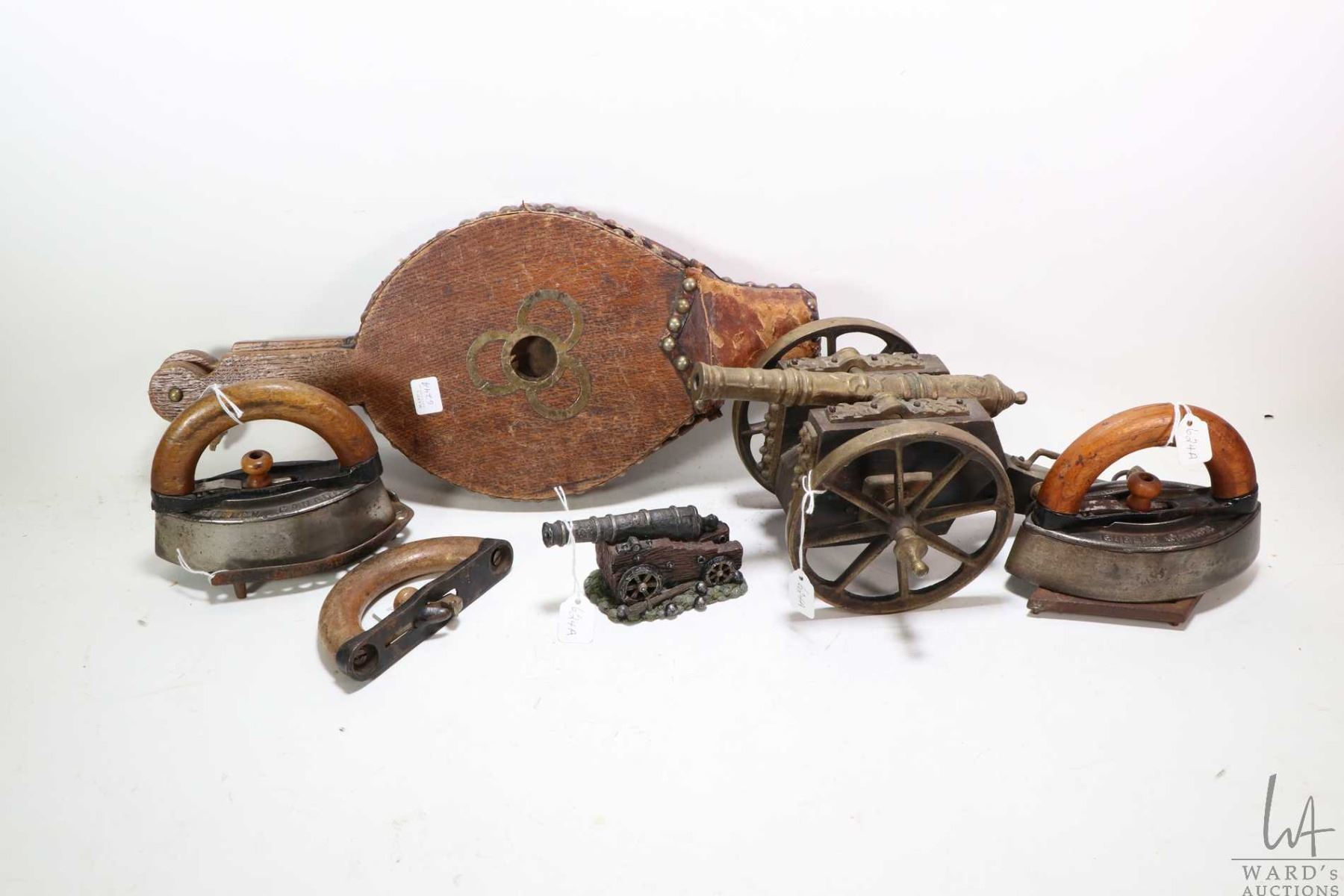 Selection of vintage collectibles including wooden bellows, two sadiron, trivets and decorators cannons
