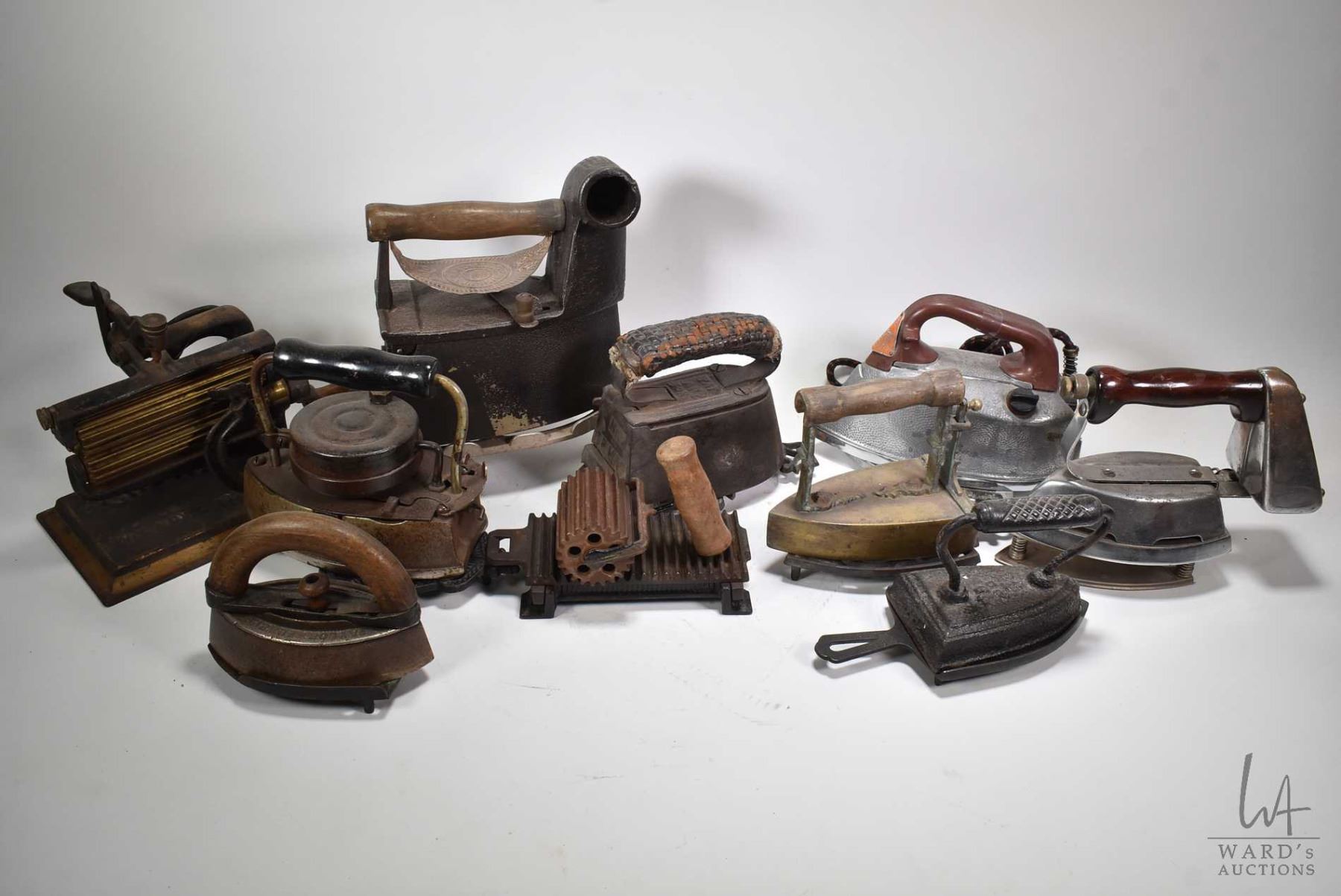 Selection of vintage collectibles irons including cast, electric, gas etc. plus a hand fabric fluter and a mechanical fabric fluter