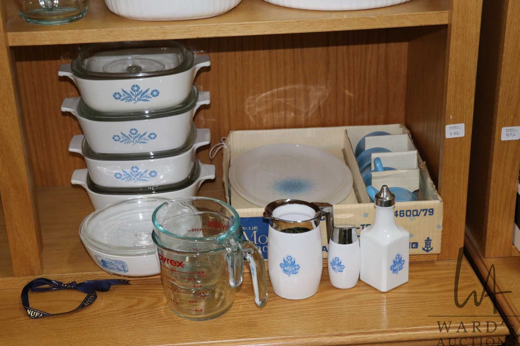 Selection of vintage cookware including Anchor Hocking Blue Mosiac snack set, four lidded casserole dishes, small lidded Corning ware pan etc.