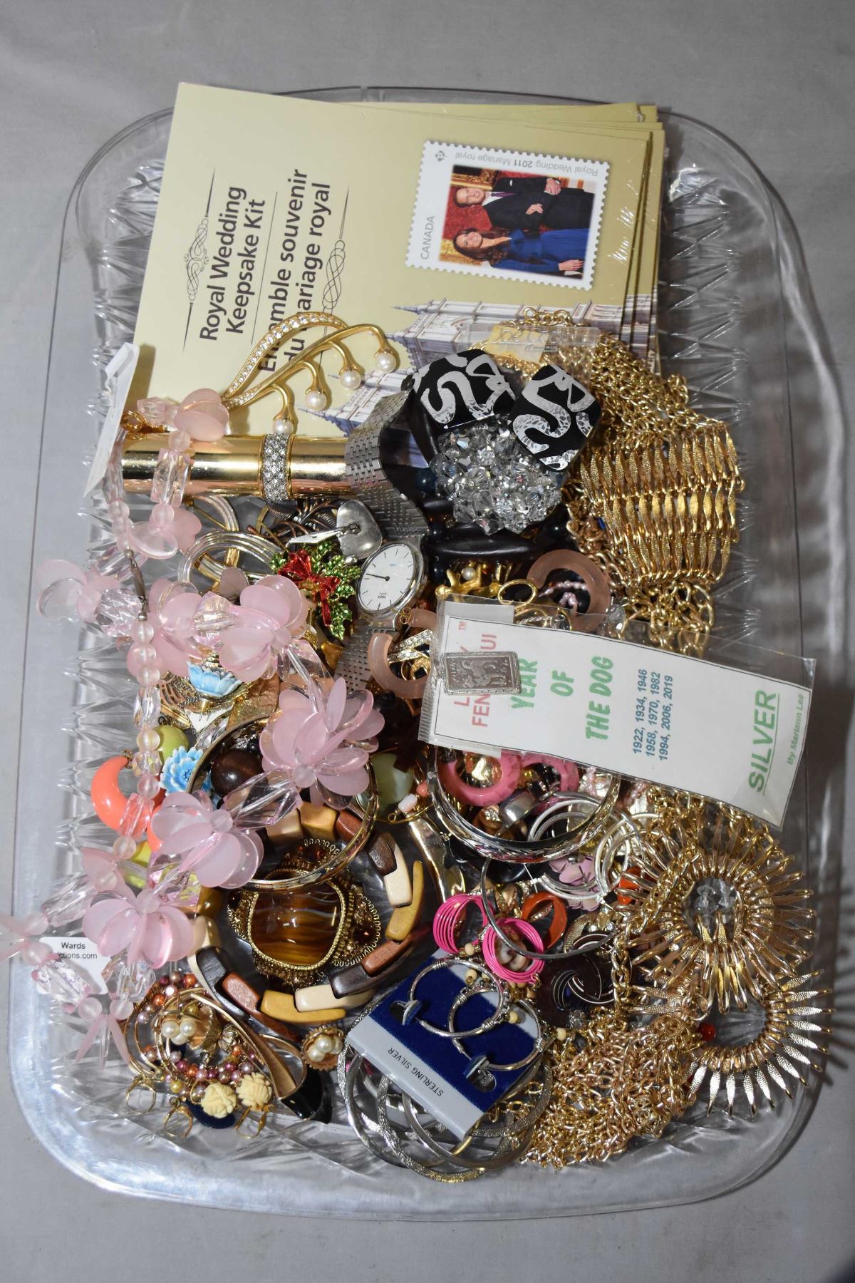 Selection of vintage costume jewellery including necklaces, earrings, brooches, chaise bracelet, sterling silver etc. plus six Royal Wedding keepsake collectors stamps etc.
