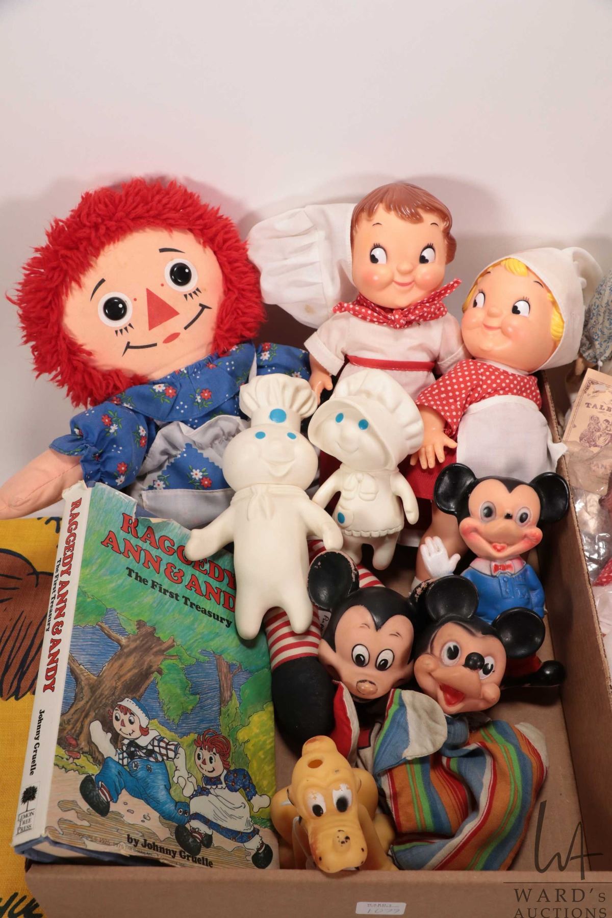 Selection of vintage dolls including Campbells Soup kids, vintage Mickey Mouse puppet, Raggedy Ann doll and book plus Pilsbury dough couple
