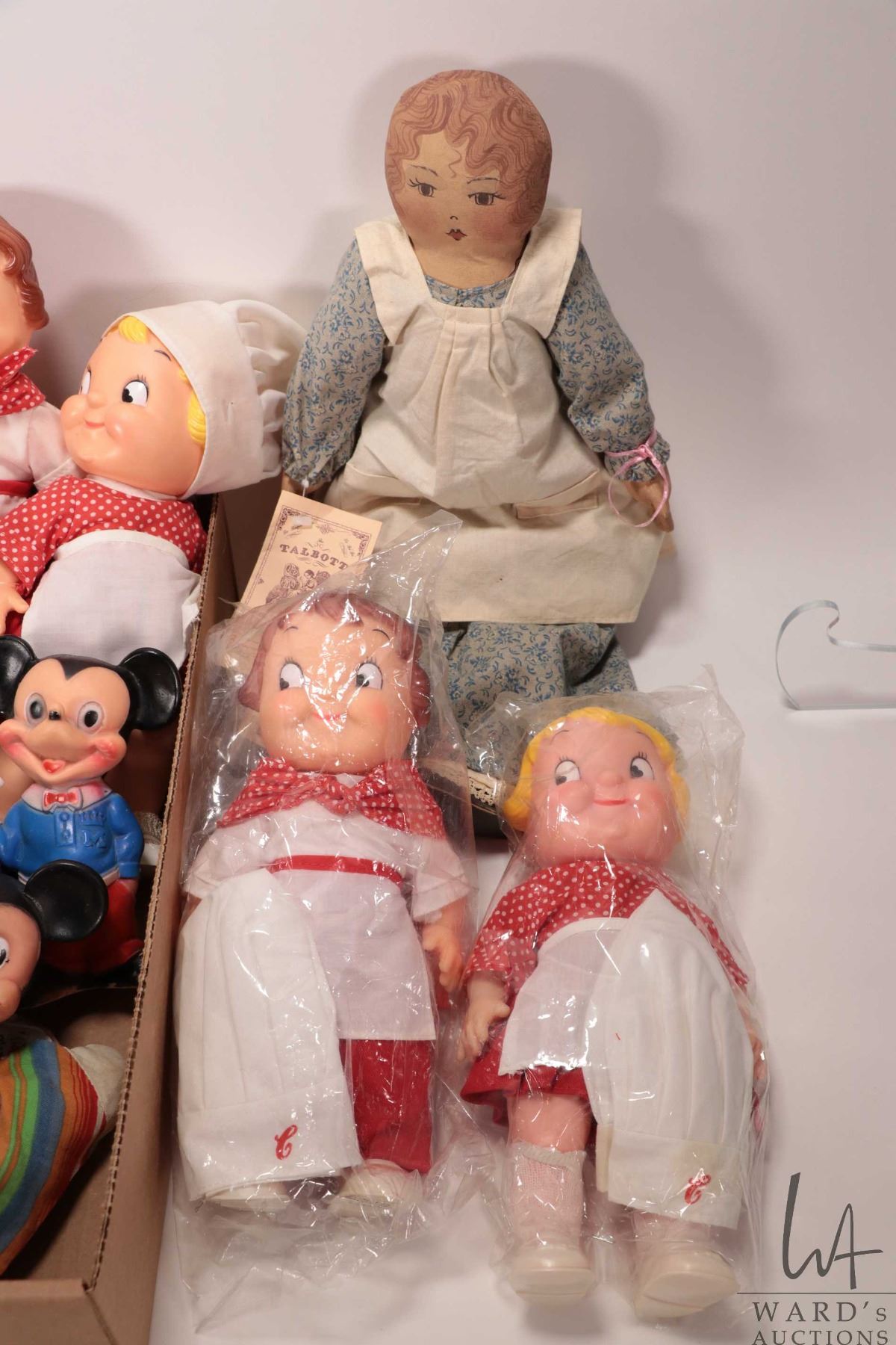 Selection of vintage dolls including Campbells Soup kids, vintage Mickey Mouse puppet, Raggedy Ann d
