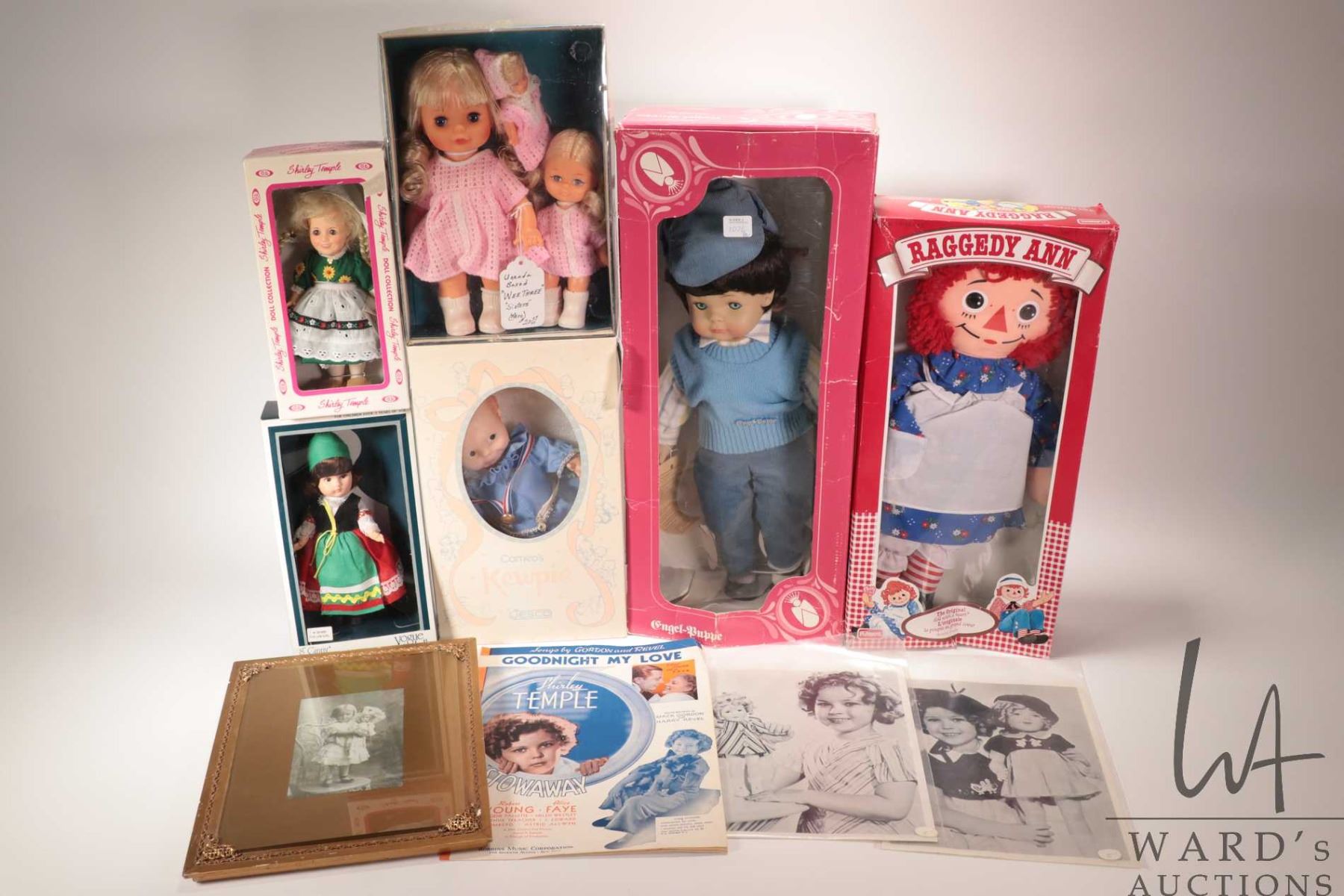 Selection of vintage dolls including boxed Raggedy Ann, Vogue 8" Ginny doll, Uneeda "Wee Three Sisters" dolls, Cameo's Kewpie doll, Engel Buppe 15" doll, small Ideal Shirley Temple doll plus some Shirley Temple ephemera etc.