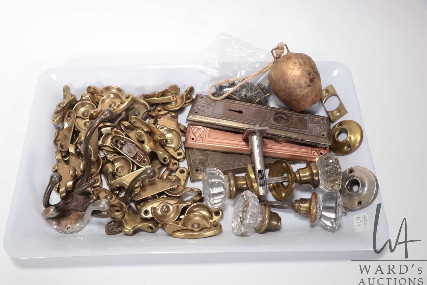 Selection of vintage door and window hardware including glass door knobs with backer plates, brass window latches etc.