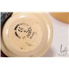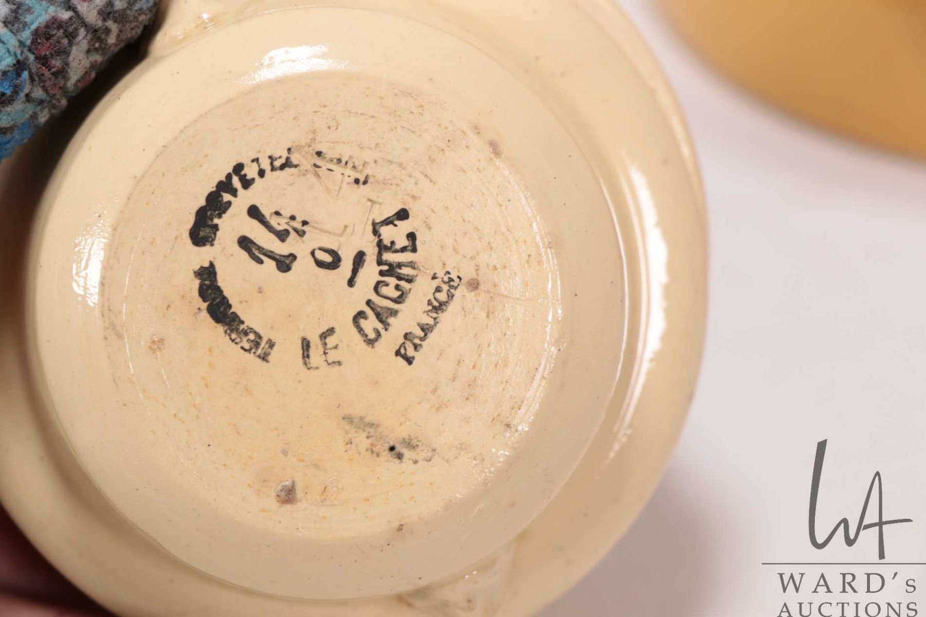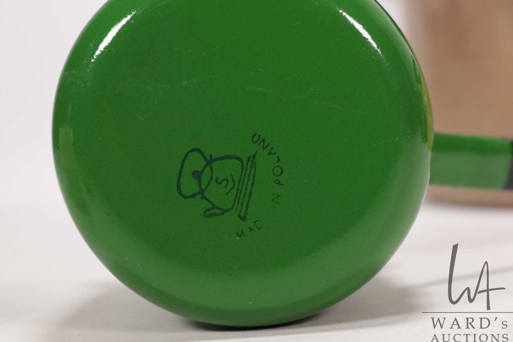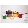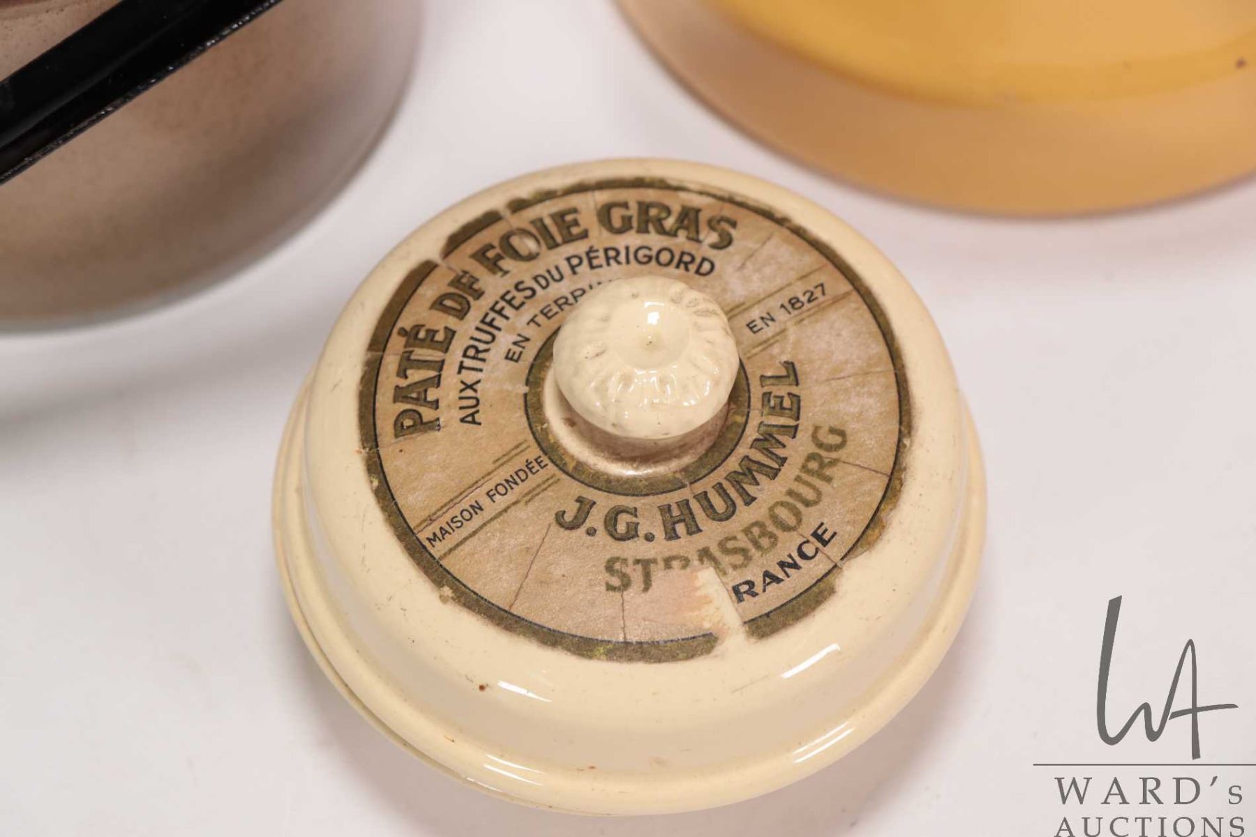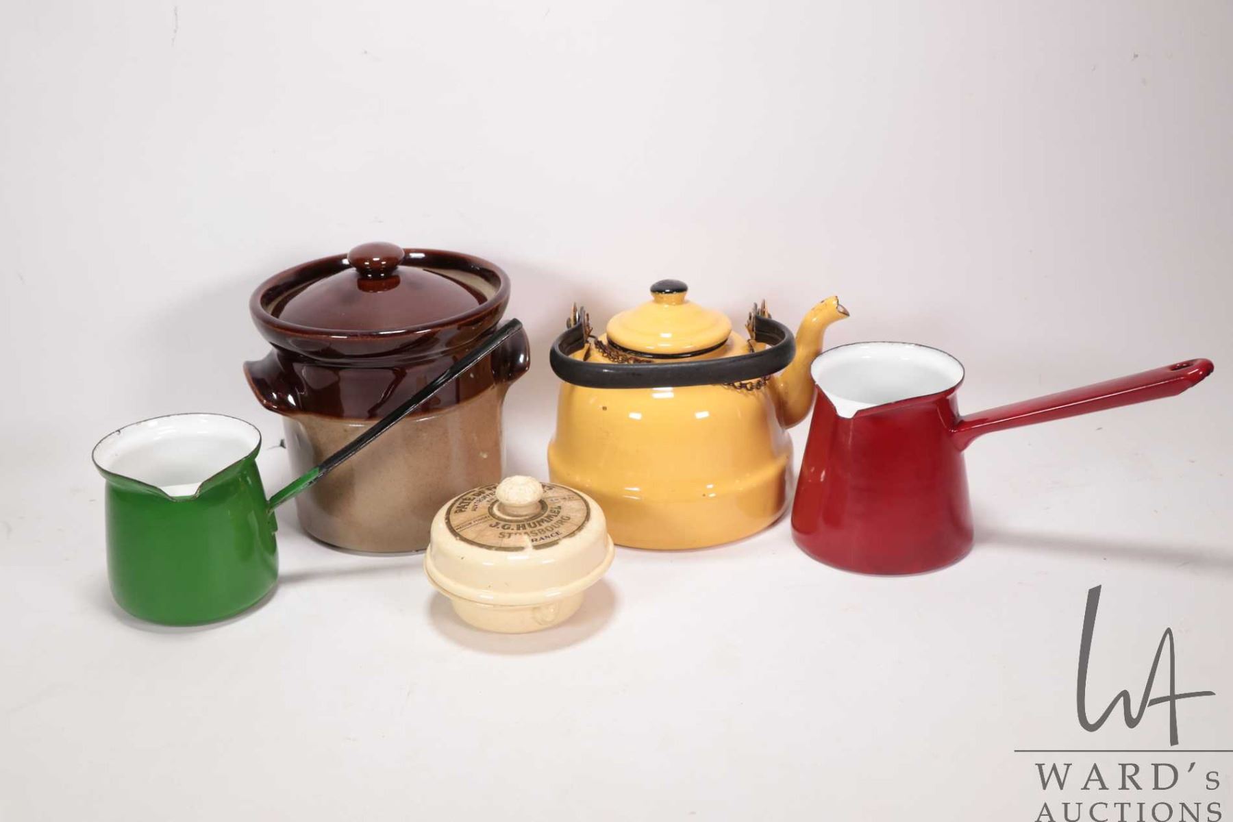 Selection of vintage enamel cookware including small kettle, and two Espresso measuring cups, an antique J. G. Hummel French Pate de Foie Gras stoneware jar plus a 5 1/2" London Cheese Company crock