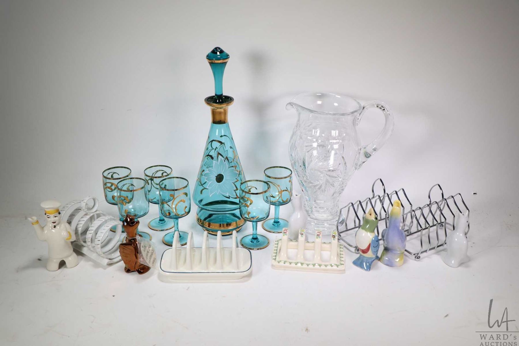 Selection of vintage glass and porcelain collectibles including gold overlay drinks decanter with six matching glasses, five toast racks including Carmargue and Masons plus six pie birds and a 9 1/2" pinwheel crystal pitcher. Note: Not available for shipping. Local pickup only