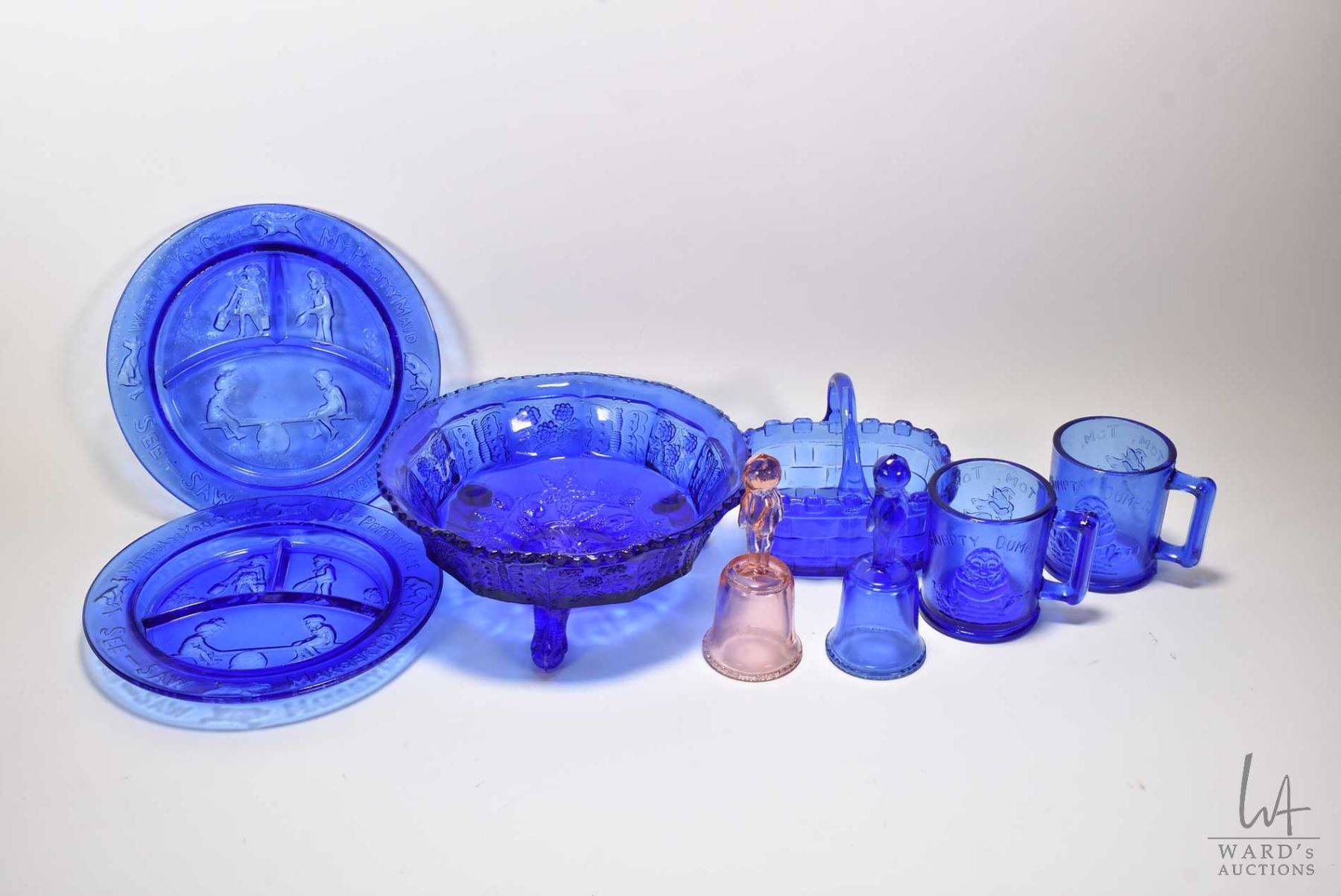 Selection of vintage glass including cobalt footed fruit bowl, two cobalt nursery rhyme divided dishes, two cobalt nursery rhyme mugs, a handled basket and two kewpie doll bells
