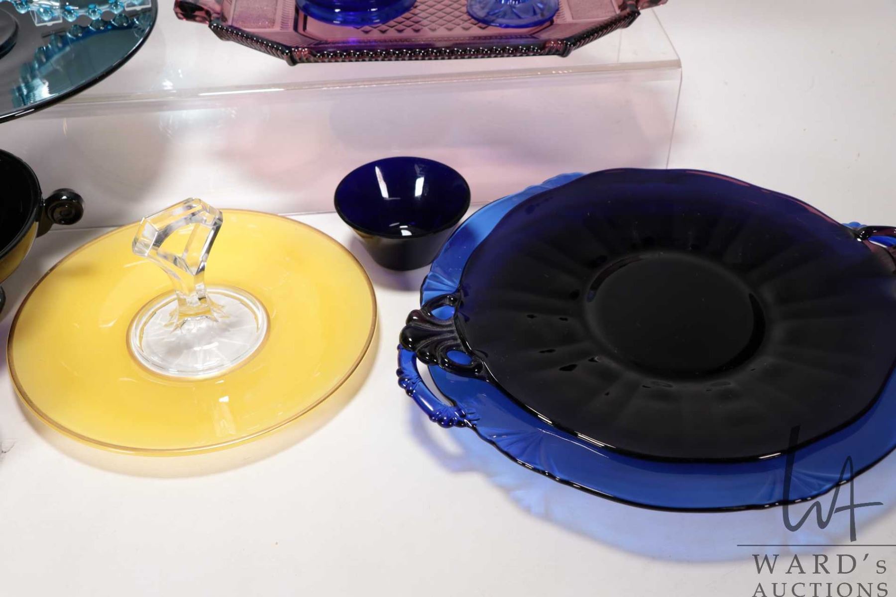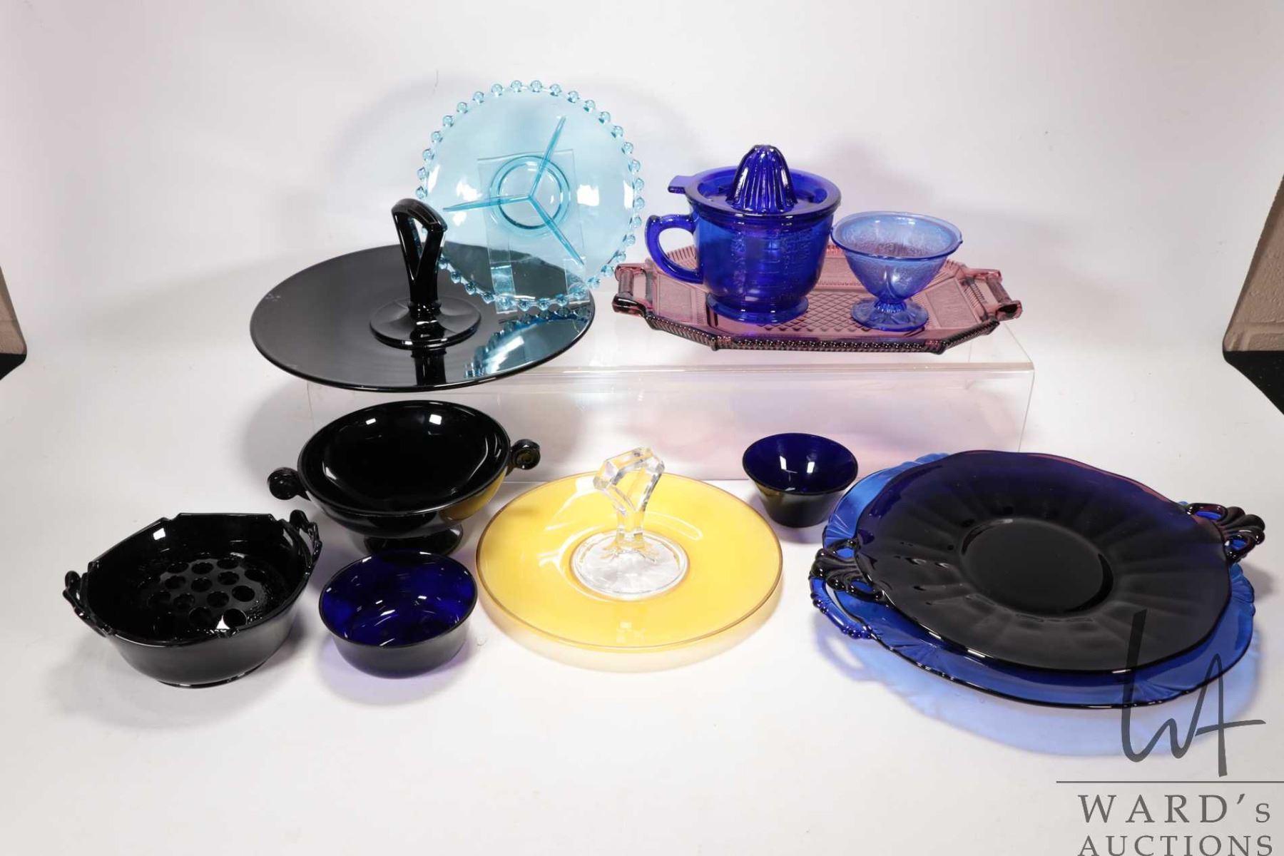 Selection of vintage glass, mostly in dark colours including handled snack plate, candlewick, reamer etc.
