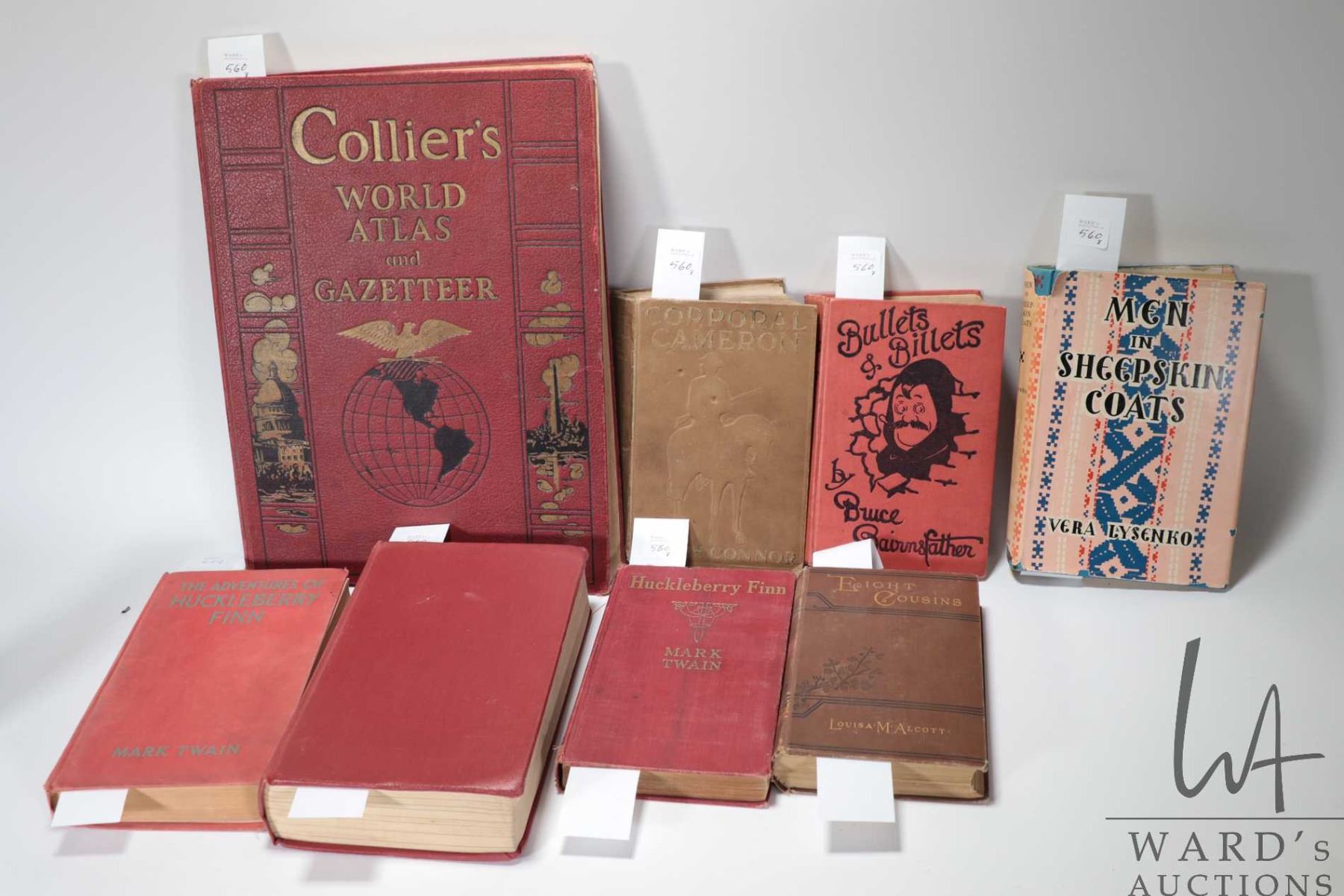 Selection of vintage hardcover books including Eight Cousins by Louisa M. Alcott, two Huckleberry Finn by Mark Twain, Collier's World Atlas and Gazetteer etc.