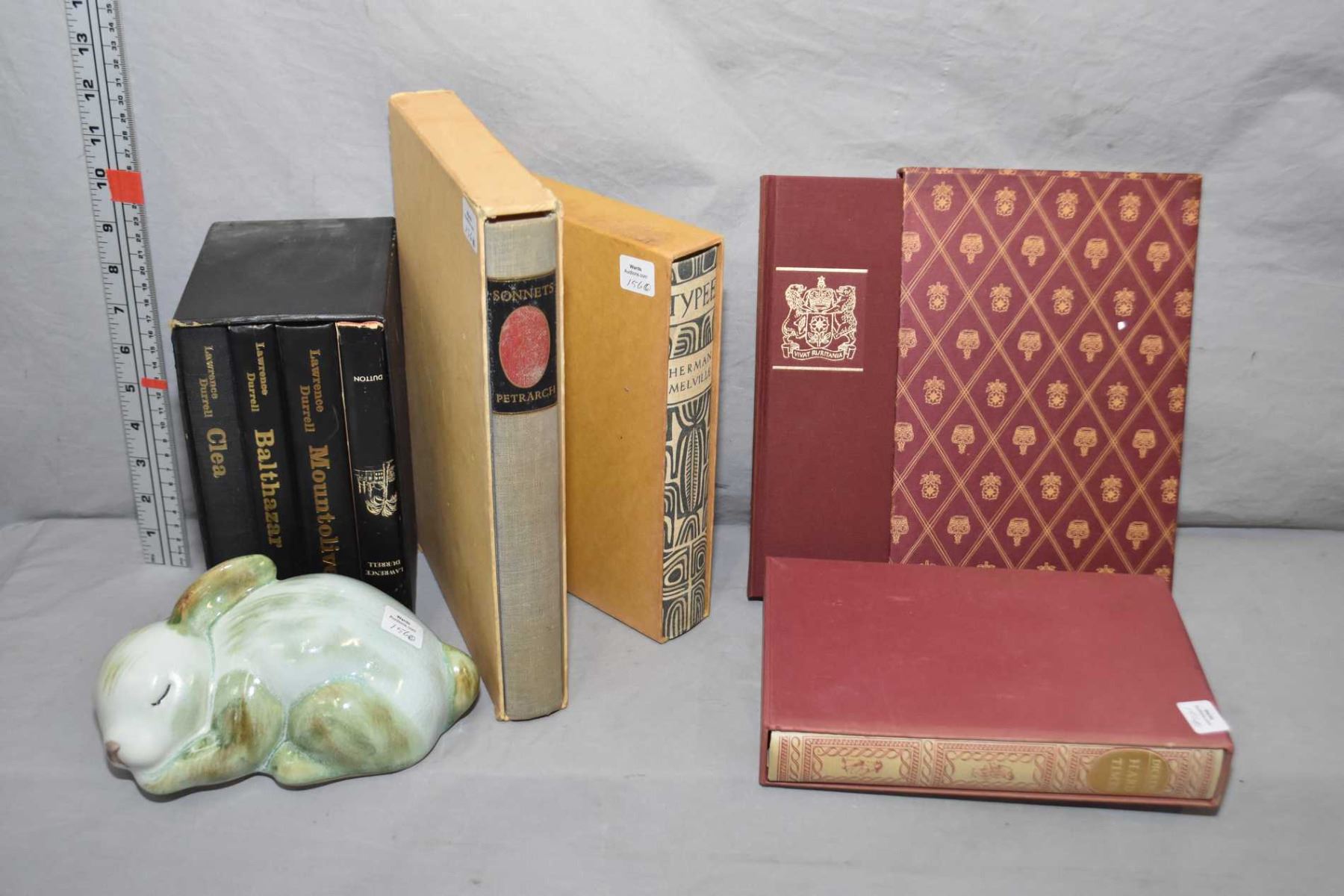 Selection of vintage hardcover books including Herman Melville Typee, Charles Dickens Hard Times, Petrarch Sonnets, Anthony Hope Prisoner of Lenda, plus a set of four Lawrence Durrell books plus a glazed pottery rabbit