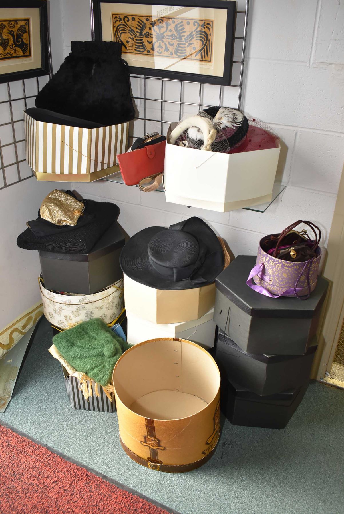 Selection of vintage hats and retail hat boxes plus vintage purses, handkerchiefs, muffs etc.