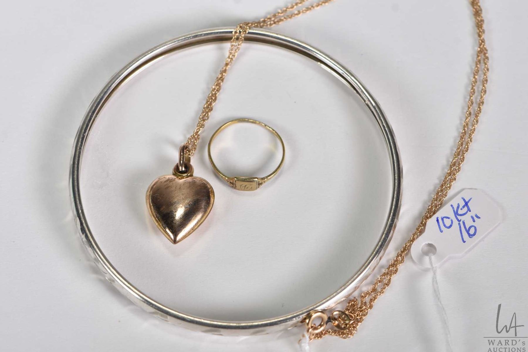 Selection of vintage jewellery including 10kt gold neck chain and heart shaped pendant, gold babies ring and a Birks chaised silver bangle