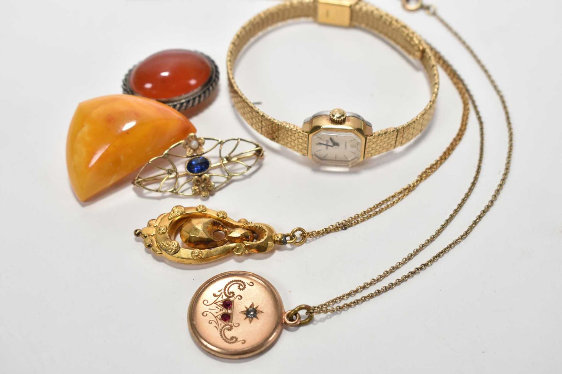 Selection of vintage jewellery including carnelian brooch, amber brooch, Caravelle vintage watch, antique brooch with seed pearls and sapphire like gemstone and a 9ct yellow gold pendant
