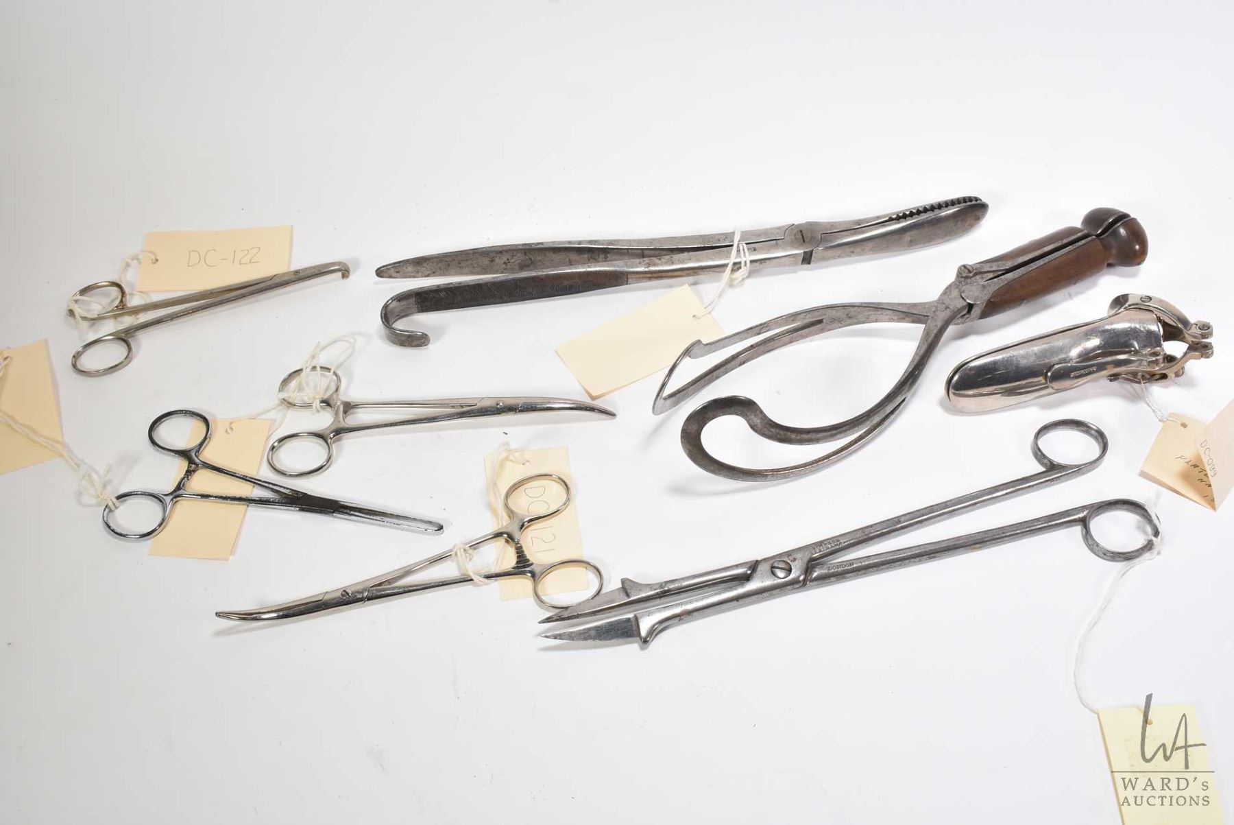 Selection of vintage medical equipment including spiked forceps, locking forceps, a speculum, large