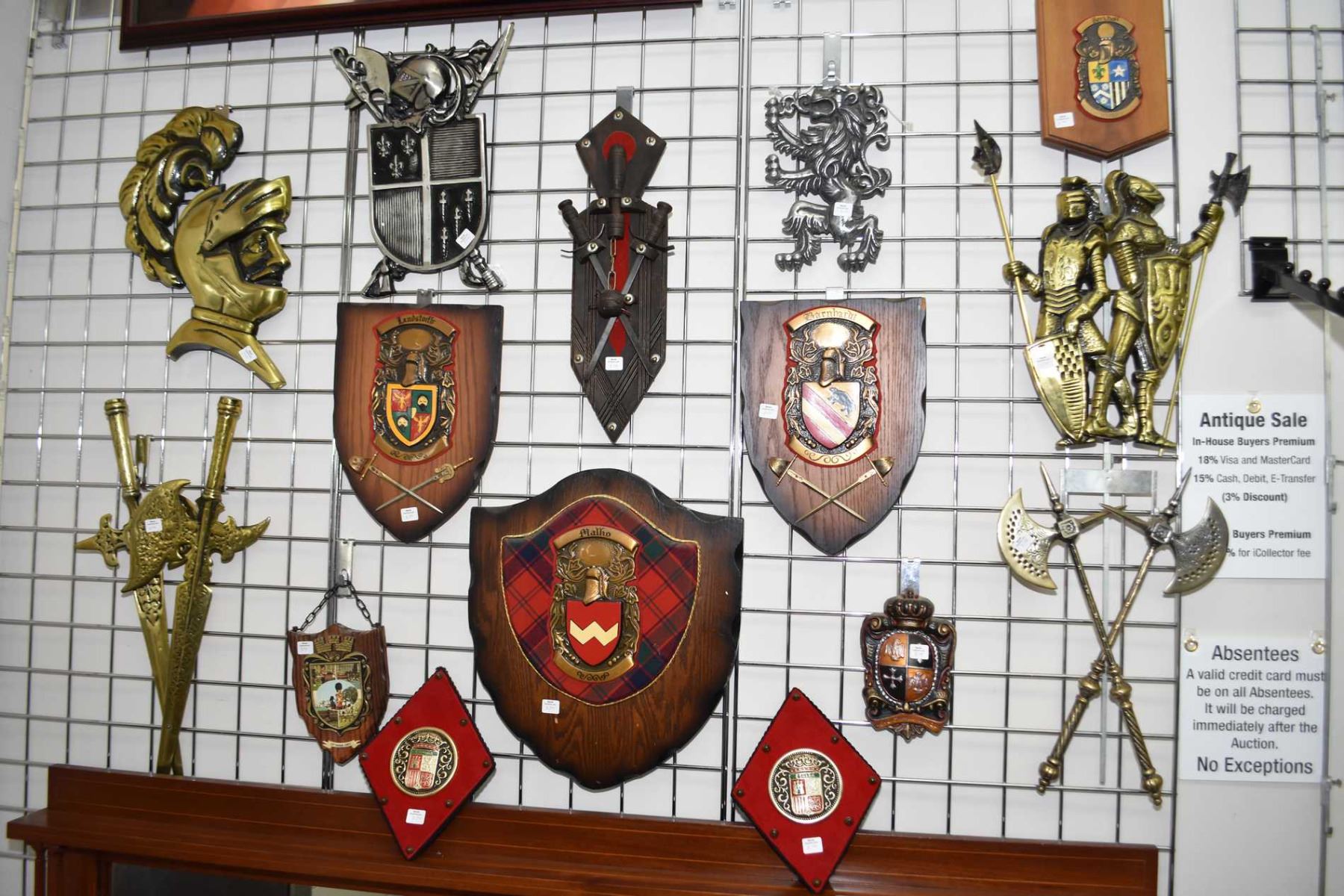 This item is not available for shipping. Local pickup only. Selection of vintage medieval style wall hangings including family crests, weapons, knights, cast metal English lion etc.
