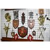 Selection of vintage medieval style wall hangings including family crests, weapons, knights, cast me