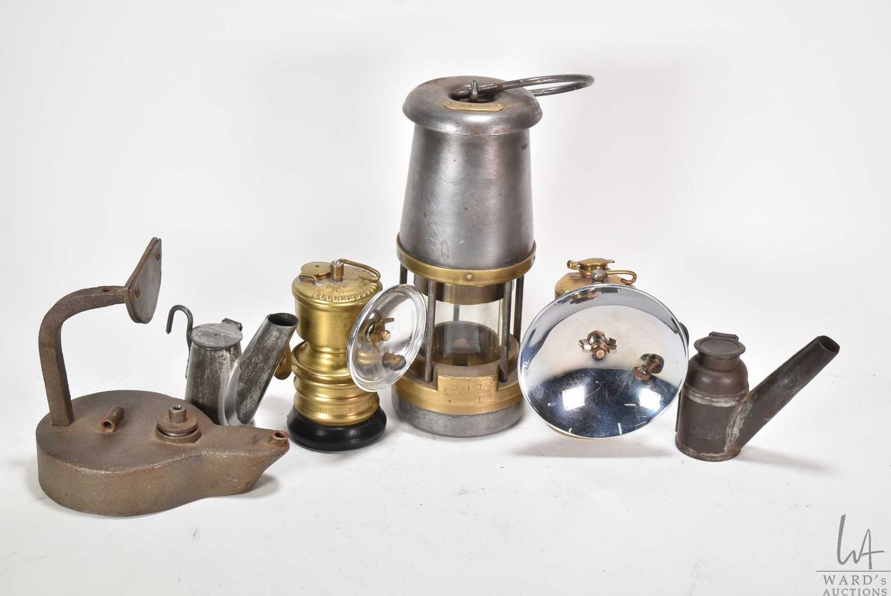 Selection of vintage mining lamps including Wolf Type FS safety lamp, cast hanging oil lamp, two helmet lamps and two small tin oil lamps